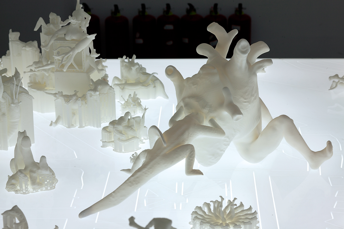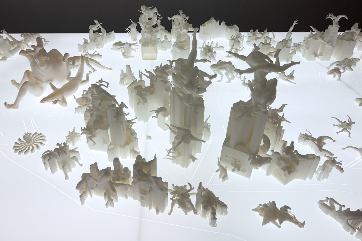 程大鹏的「可乐乐园」拟造了看似「创世纪」的伪形,实际却更接近「世纪末」或「末世」的异象。在艺术史上,以「救赎」和「堕落」作为辨别天堂与地狱的意象象征,最经典的莫过于出身荷兰的北方文艺复兴画家博斯(Hieronymus Bosch, c. 1450-1516)于16世纪初期所完成的《人间乐园》(Garden of Earthly Delights)巨作。无论从创世到末世,从伊甸园到失乐园,这整套人类因原罪与堕落,而必须等待终极救赎的大叙事,没有例外地都是出于天主教神学的图像系谱。程大鹏的「可乐乐园」倒是看不出这样的信仰要求或议题演绎。事实上,他所编造的各种图腾式的人形变体,更多地是他在面对中国当代城市的现实时,极为个人而直观的感受。