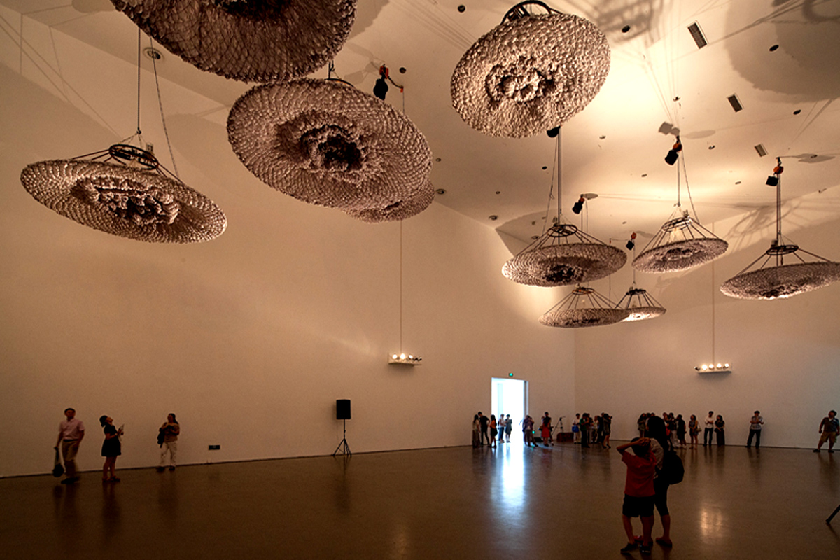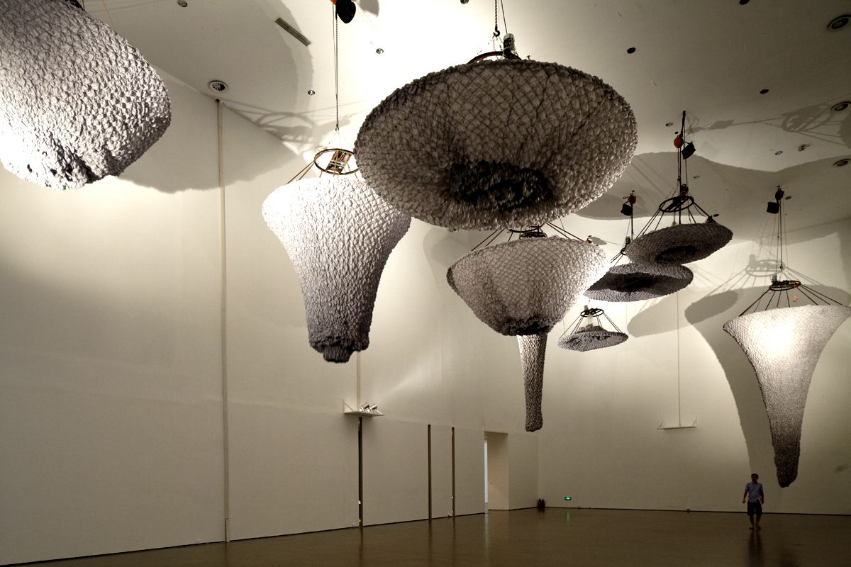 构成城市的建筑是多方面利益共谋的结果,展现的往往是虚假的城市文化、虚假的城市历史、虚假的城市生活,作为个体的人是无从逃避和选择的,环绕身边的是狰狞的风景带来的视觉快乐。我把展厅的整个顶部做成一个互动的装置,将一个常规空间改变后创造出非常规体验,试图探寻建筑与雕塑或装置之间的另一种存在关系。装置本身的不确定性和变化的复杂性可以改变建筑空间几乎一切固定的元素。