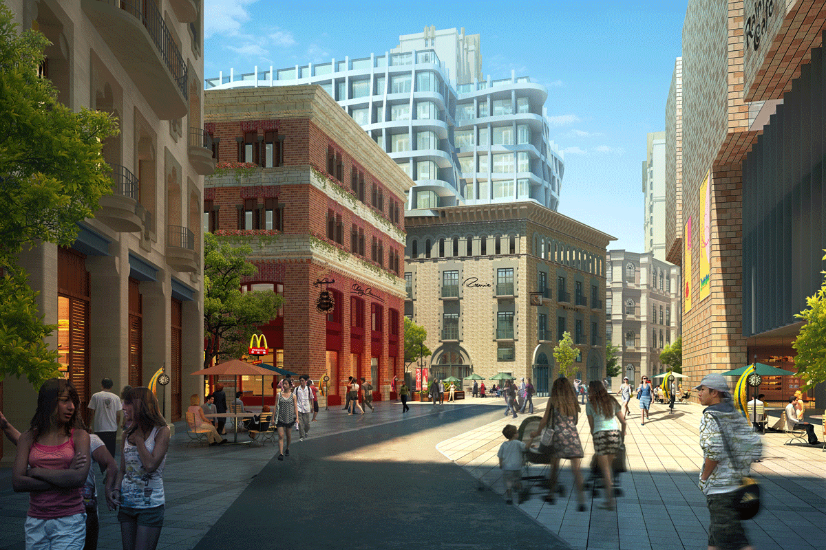 Three facade symbol elements that demonstrate Europe culture in this project are Culture symbol element, Shortened notation and pure Contemporary symbol element. Under the modern institutional environment and operation mode, reflect the nomadism space method in the commercial district. Apposite multicultural scenes from different era and mix multi-architectural elements together, will attract more costumers and stimulate the energy of the block.