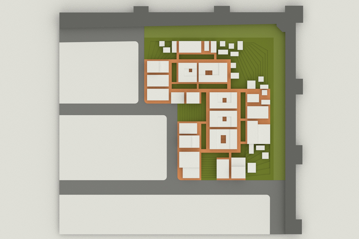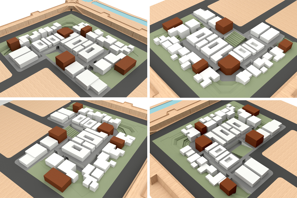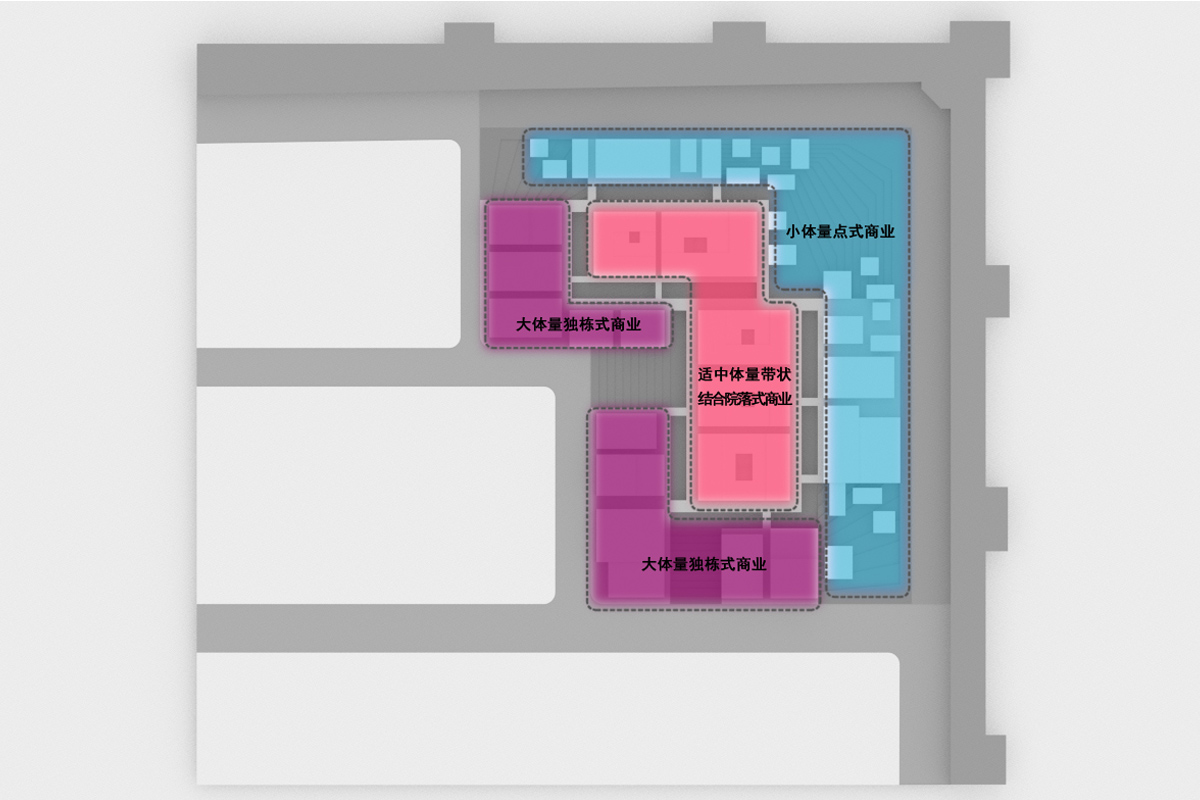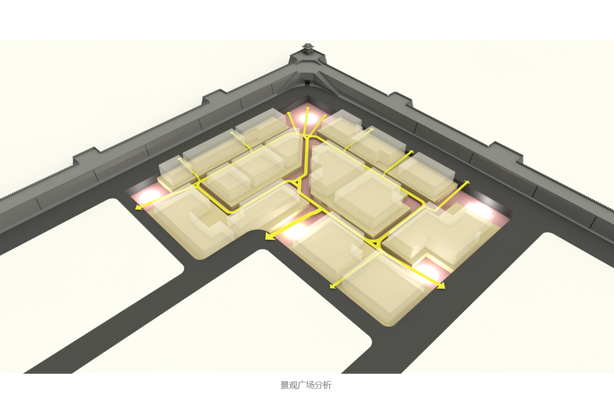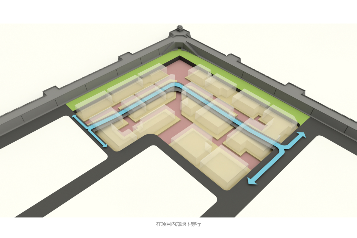 废除用地内的社会机动车路,只使用用地靠城内一侧的城市支路,另外在用地内部做下沉式商业街,设置景观游览车,将沿城墙的所有节点和片区串联起来;