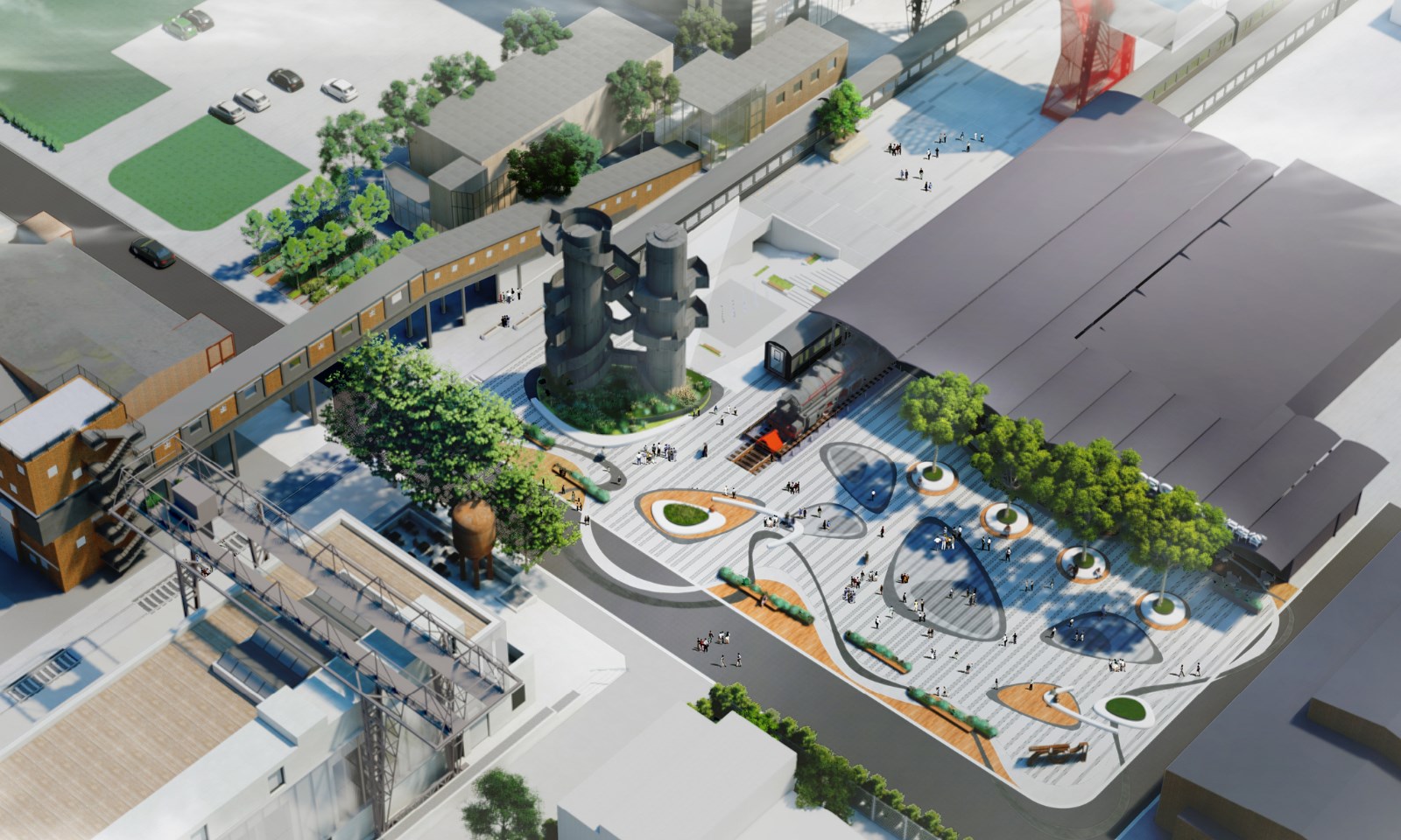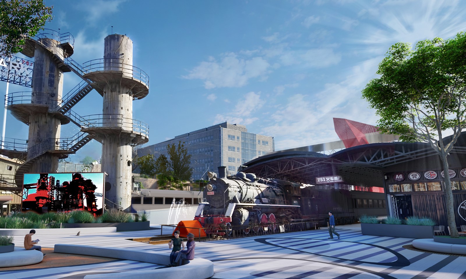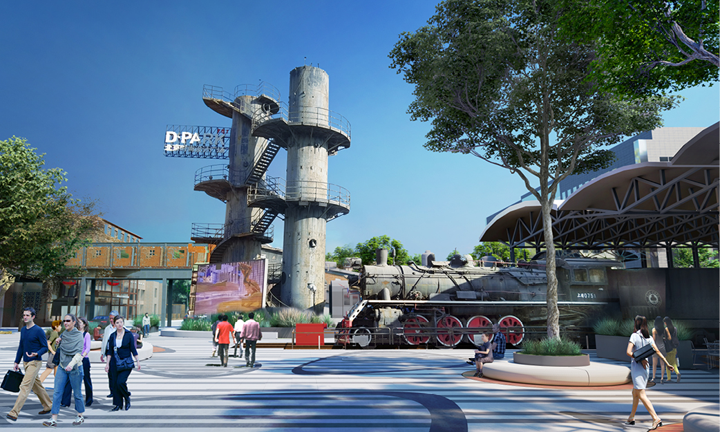 本次改造的“火车头”广场是751内重要的广场,751与798联结的重要节点,也是游客聚集的主要空间,广场内散布着大量独一无二的工业遗迹(火车头、双塔罐、输煤廊、天车等)。