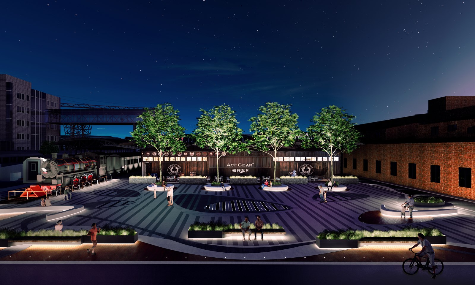 4. 751内存在很多工业遗迹,这些工业遗迹都具备着强烈的“冰冷的秩序感”,火车头广场设计通过铺地的变化,材质的灵活运用,柔化整个区域,让区域变的更加温暖、宜人;