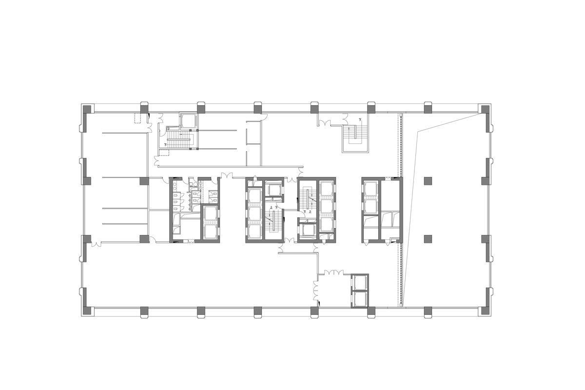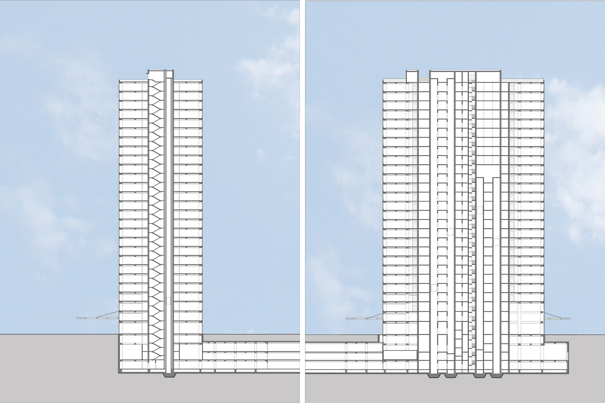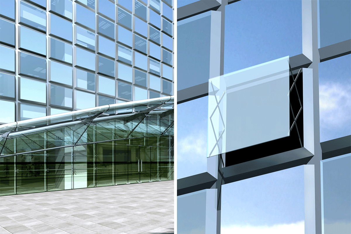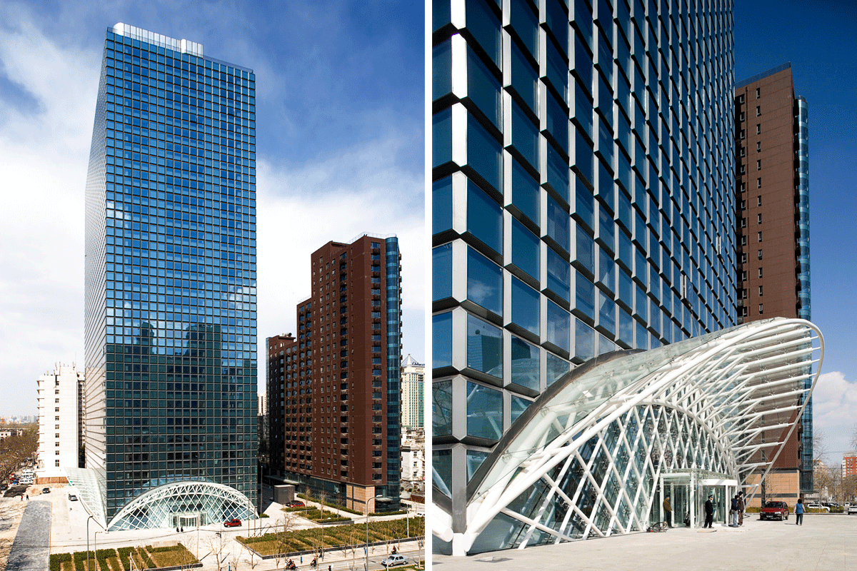 1#楼定位为5A级写字楼,2#楼定位为高档公寓,建筑布局采用围合式,注重楼体之间自然围合而成的空间与周围喧闹环境的对比,从而在基地北侧为使用者营造了一个静谧的内庭院。为体现本项目尊贵,成熟的商务形象,建筑设计时更多考虑的是使用者的感受,落地的大片玻璃,大块的实墙分割,科学的实墙面与玻璃面的配比,使本建筑更富有内涵的同时,更加注重节能,体现了本项目对环境的尊重。
