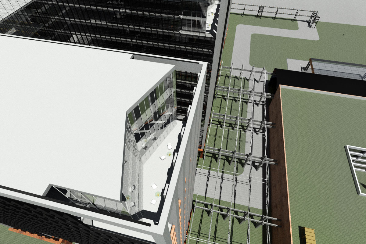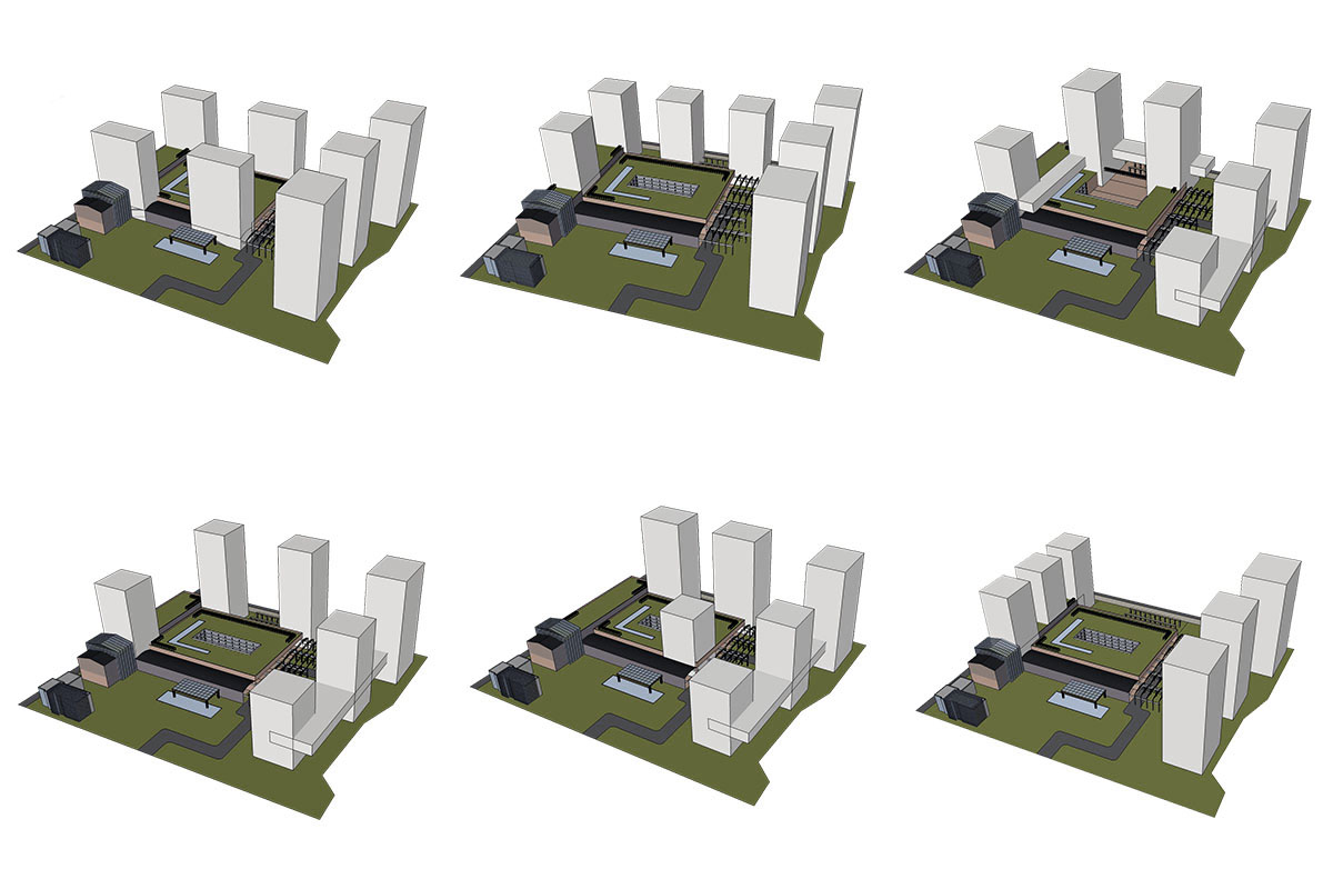 从这个核心出发,我们设计本项目地块西侧的新建筑的原则是安静。在外形上,抛弃高低错落的建筑布局,选择均一的高度;在色彩上,抛弃浓墨重彩,选择朴实的颜色。建筑本身有朝气,有规模,同时又很安静,不会喧宾夺主,能够很好地融入现有建筑的风格,衬托出旧厂房的历史感,强调新旧之间的对比。