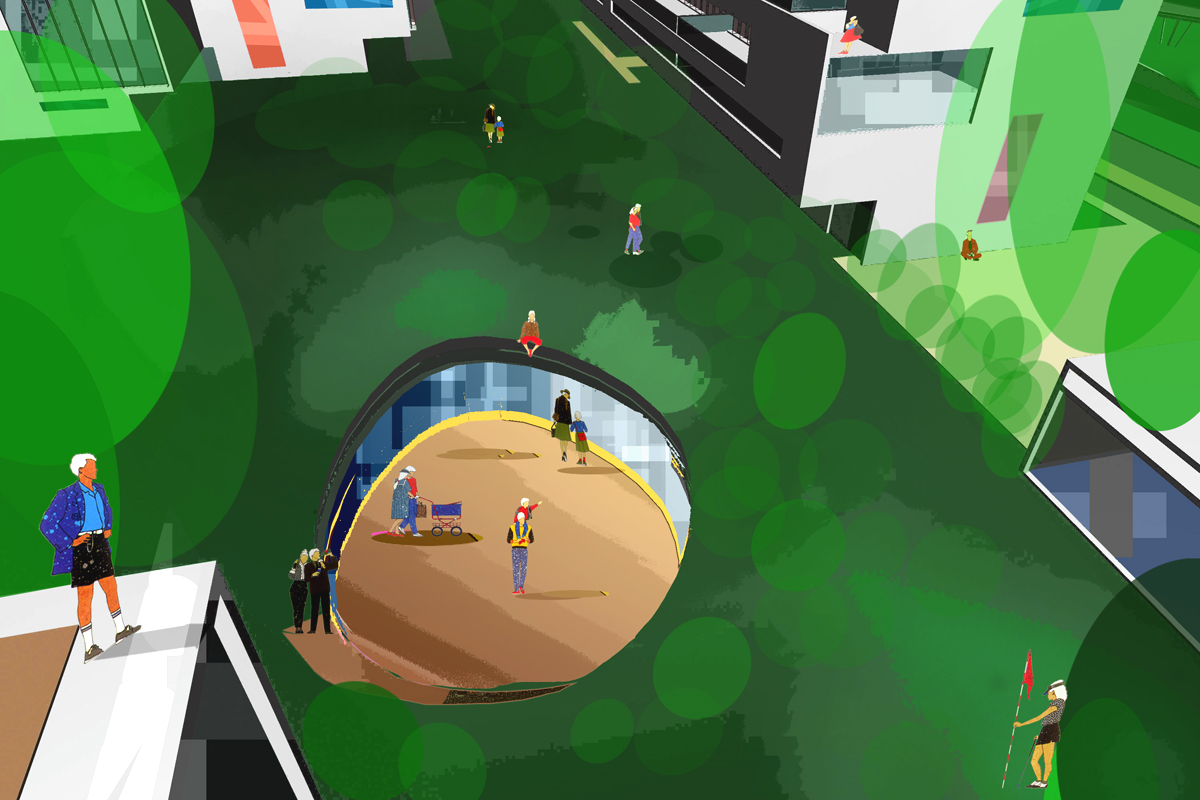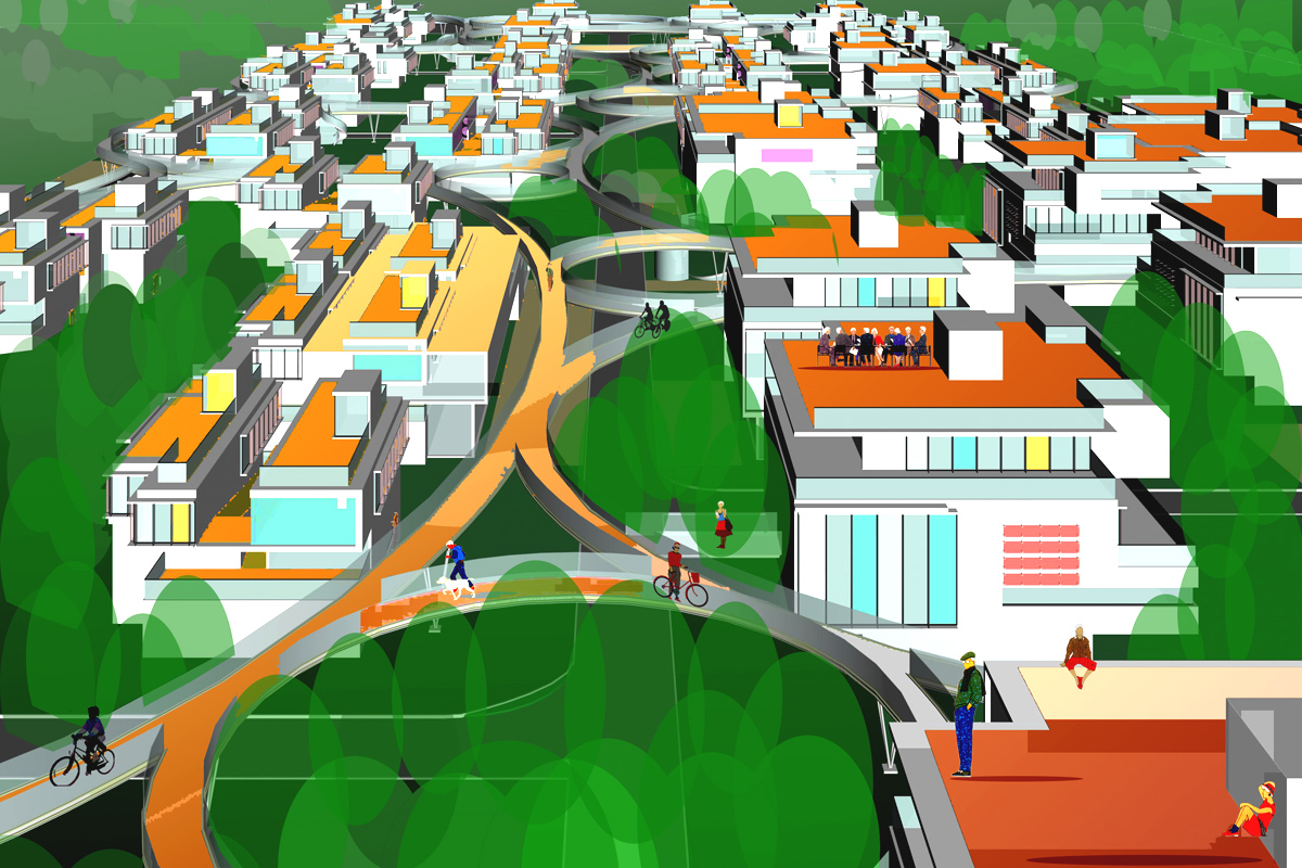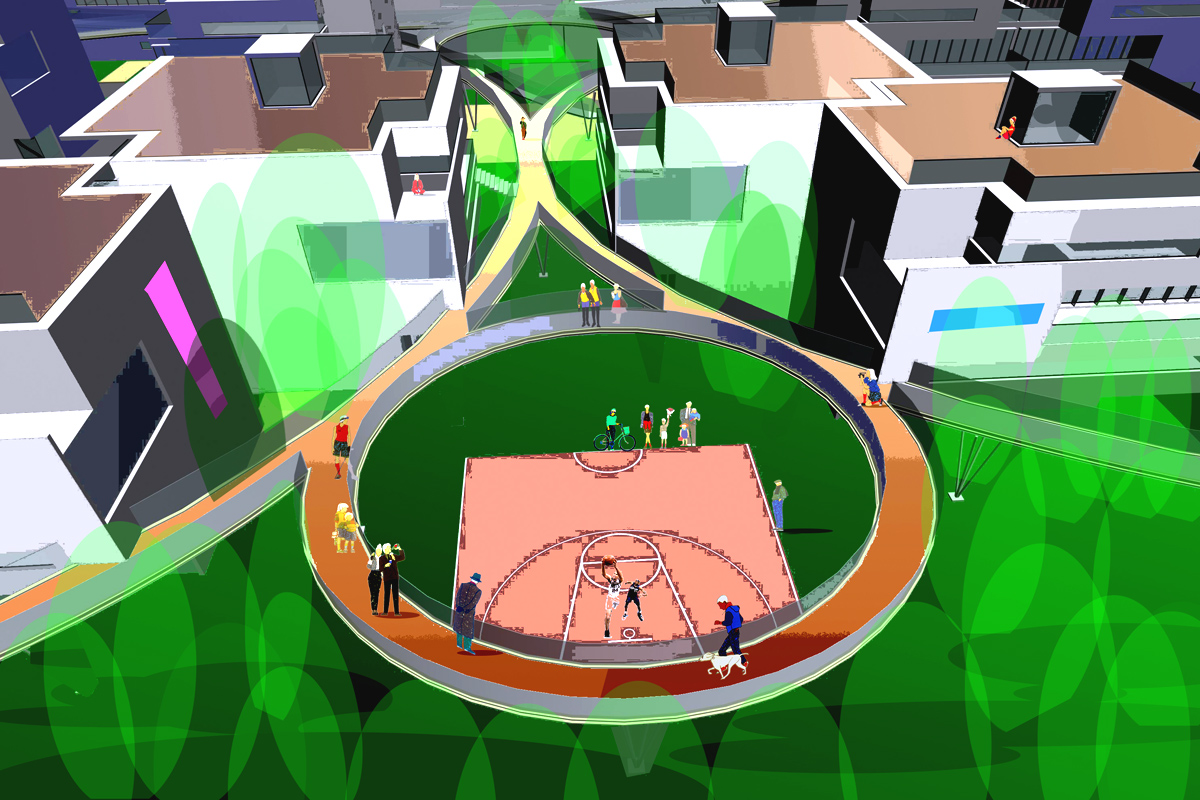 Based on the present allocation of trees and road network, the entire layout partitioned different zones by functions, but not isolate from the whole area, to form a unity. In the function area, we categorize the estate into 3 parts: “Dong”, sub-”Dong” and “Jing”. We utilize road network and the center green space to connect different function zones, and also avoid them from affect each other.