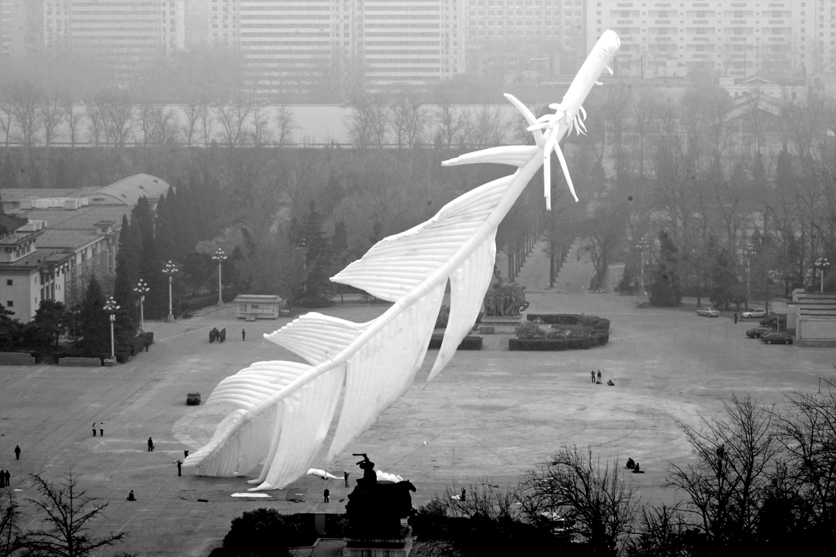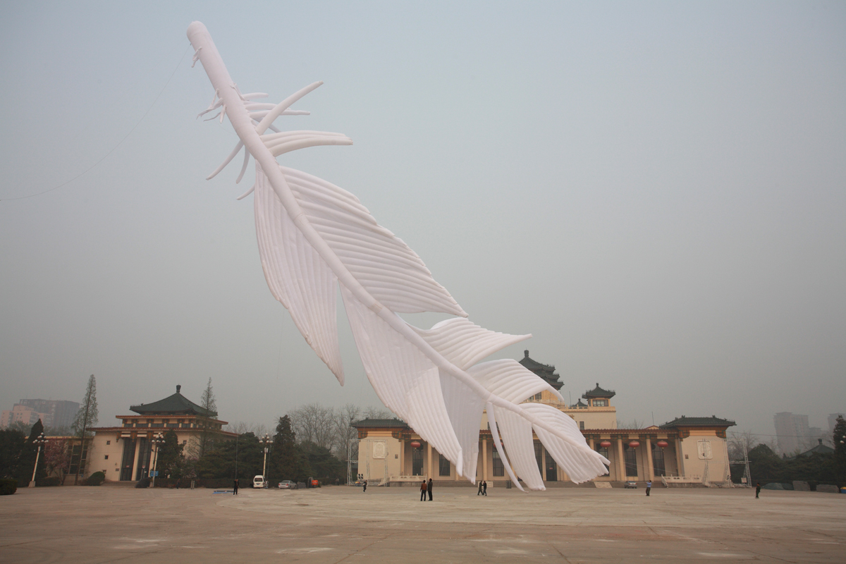 謝:你曾經說這個狀態是可樂的狀態,跟你進行的反諷或者是嘲弄是同一性質的東西嗎? 程:有一部分是反諷,但更多是可樂的,這一個羽毛做到最後應該是一個傷感,悲傷,不美,很糟糕,頹廢的,一切負面的,而且趕上那一天是一個非常好的沙塵暴的天,我覺得這個非常好,比我以前想的藍天白雲飄著羽毛還要好。