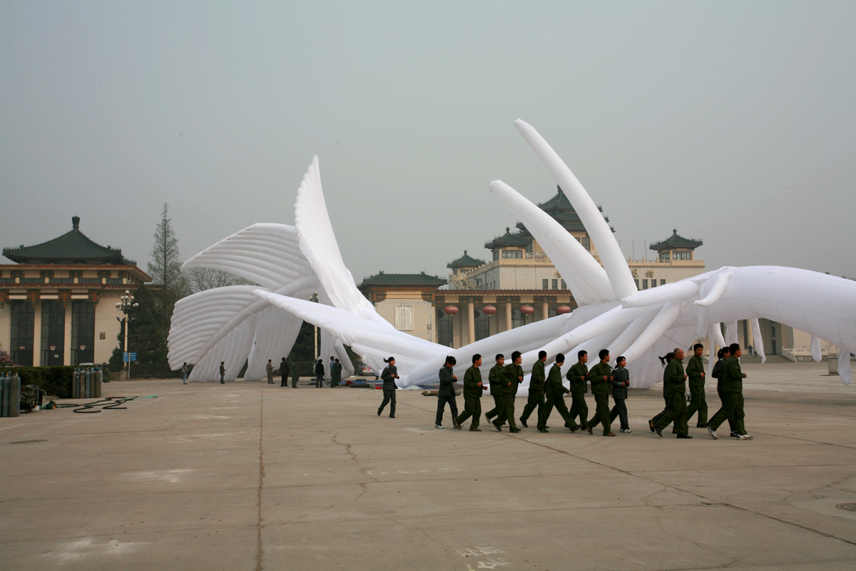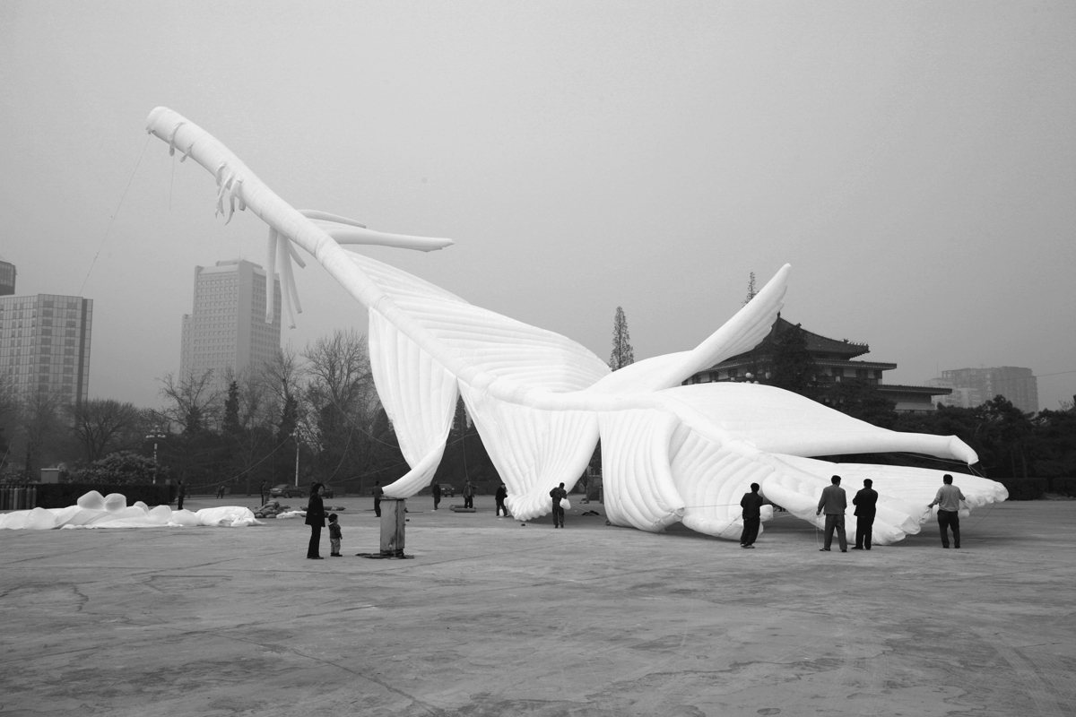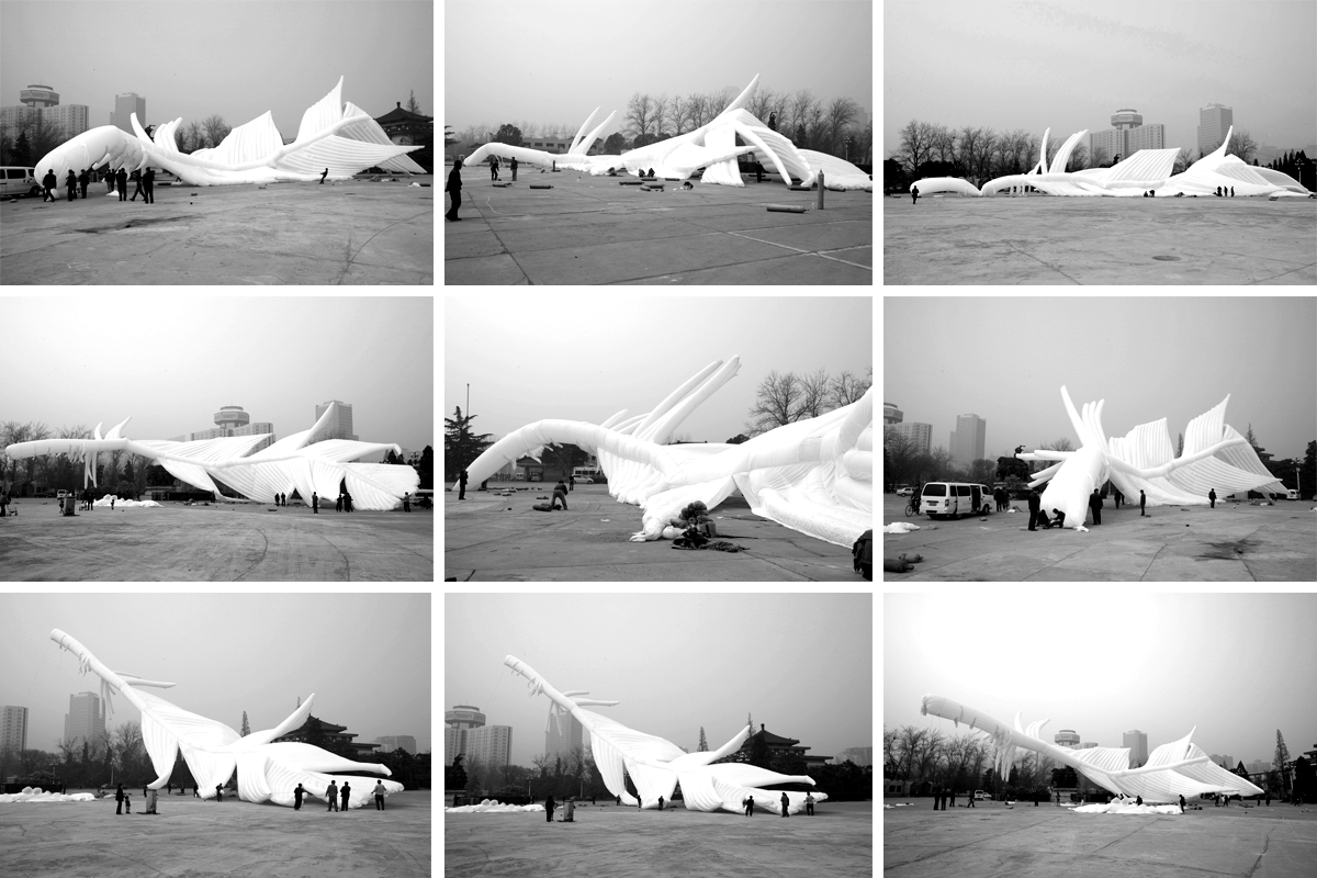 程:特別符合,非常糟糕,北京表面本身應該是個特別潔白的東西。羽毛裡充滿著氦氣。後來浮力太大把後面又給剪了,這一堆布剪了十幾米,怕它浮力太大了。都是扭曲的。 謝:真的飛起來時與你預期是一樣的嗎?。