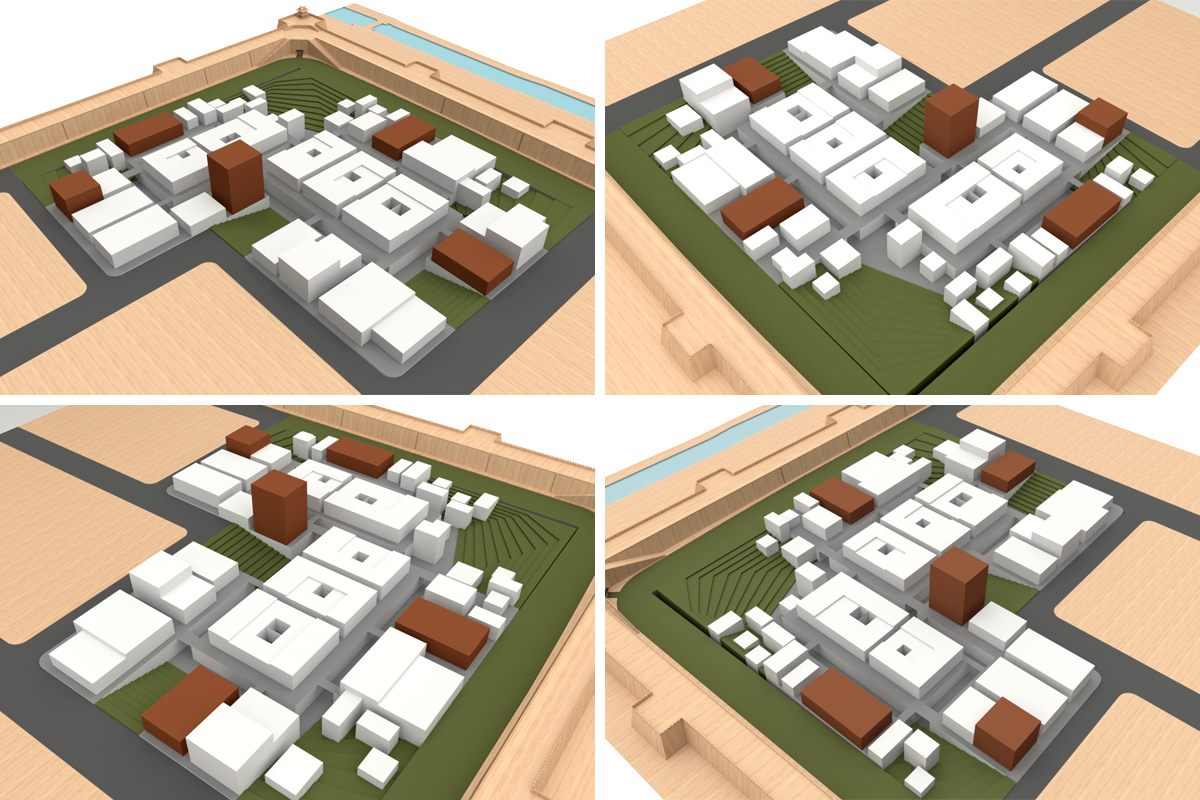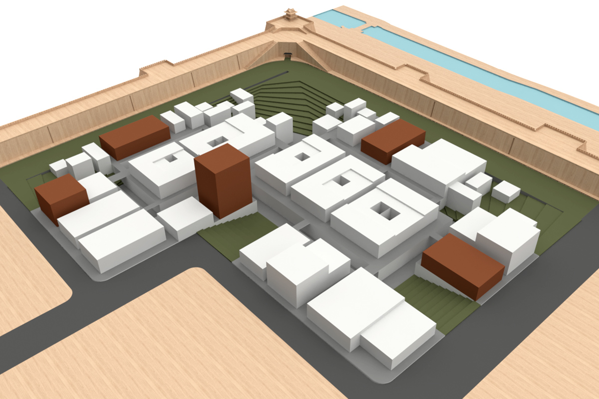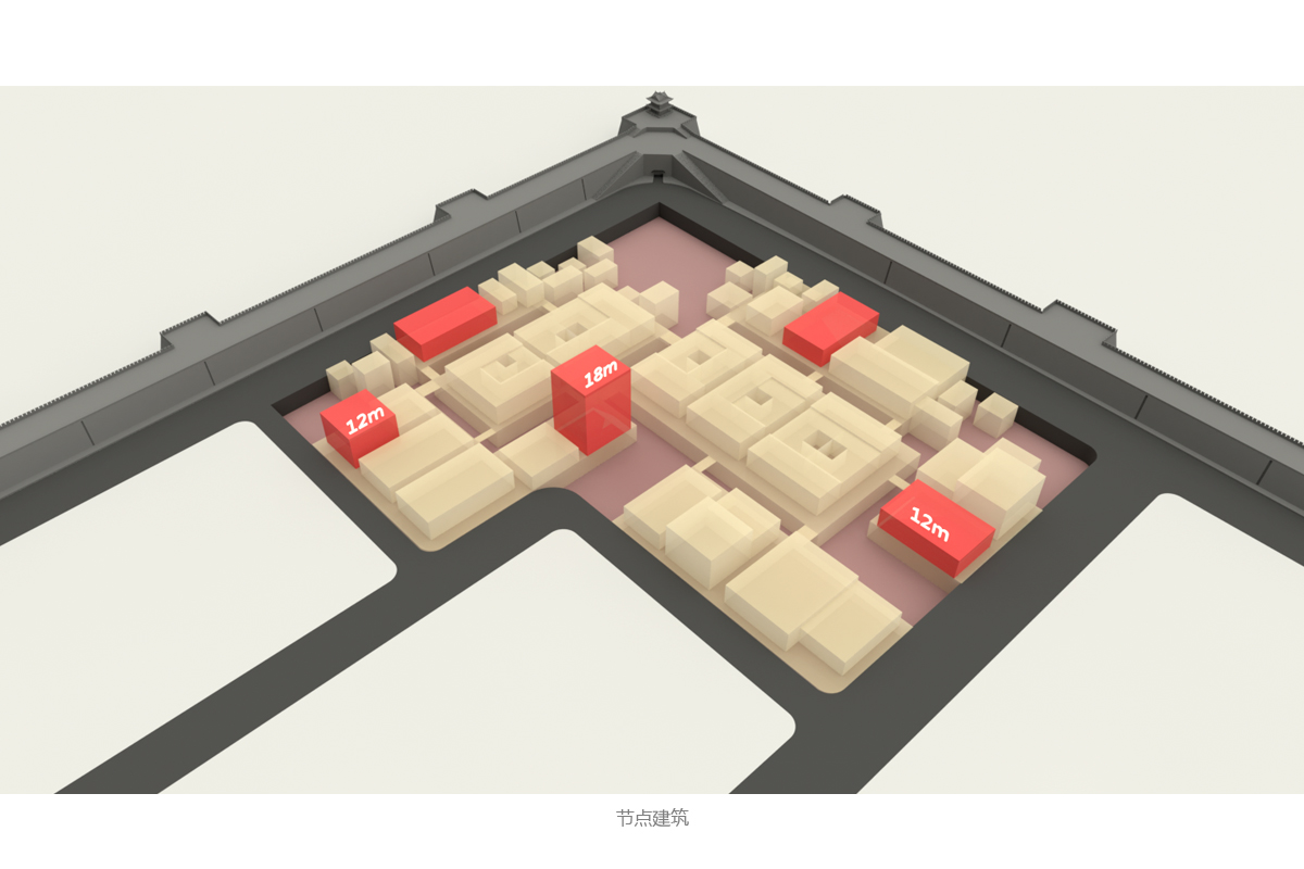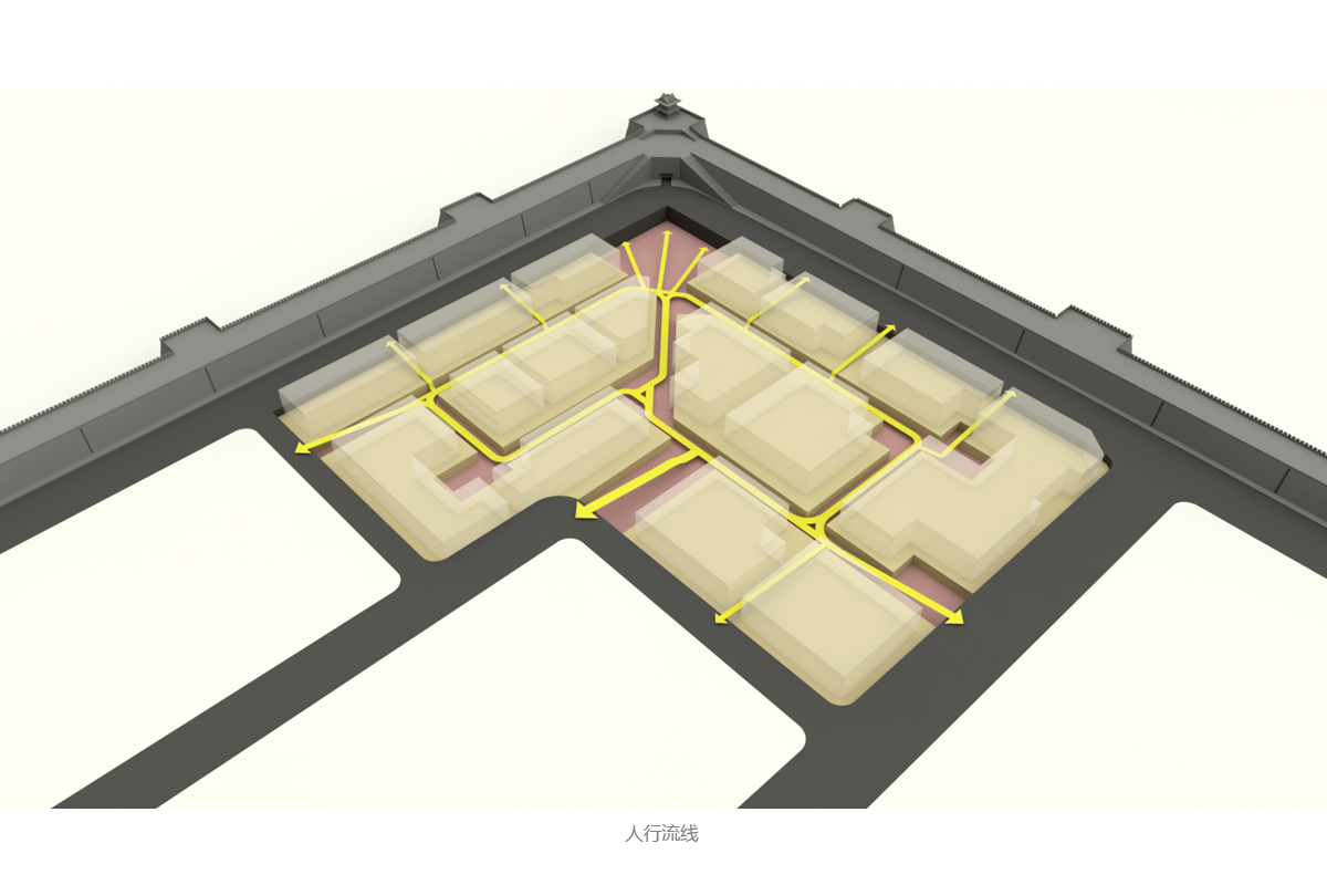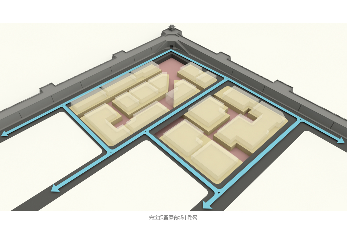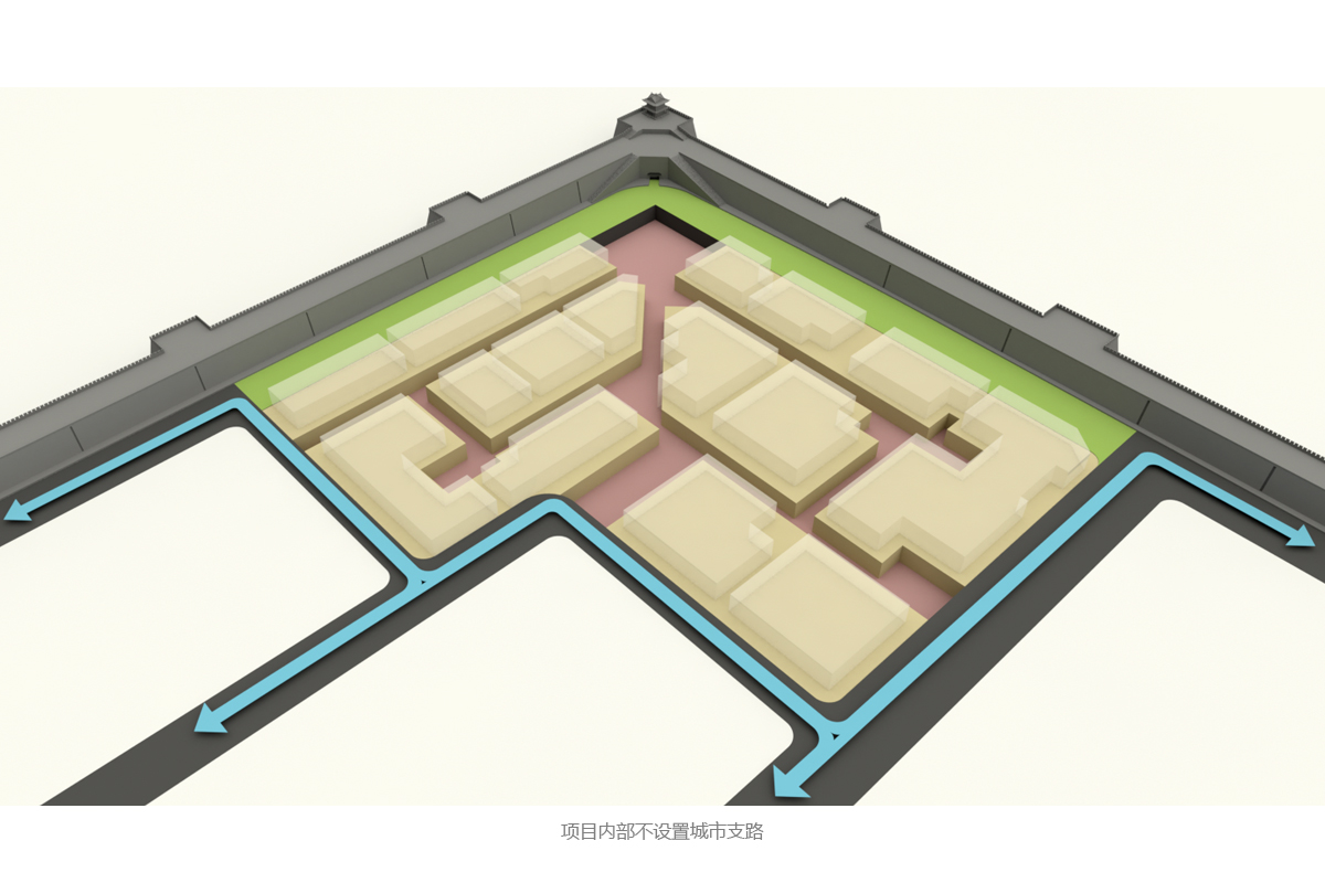 废除用地内的社会机动车路,只使用用地靠城内一侧的城市支路,另外在用地内部做下沉式商业街,设置景观游览车,将沿城墙的所有节点和片区串联起来;