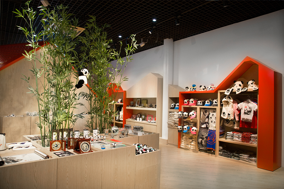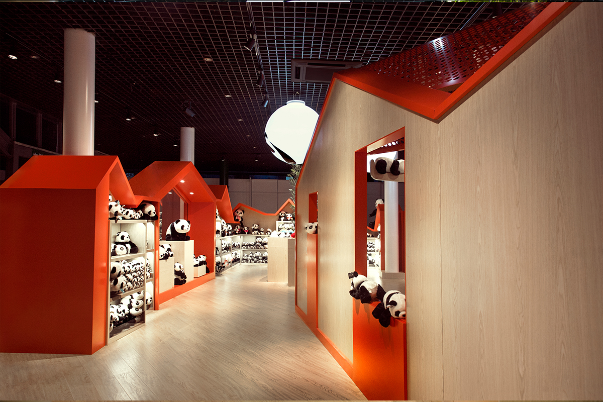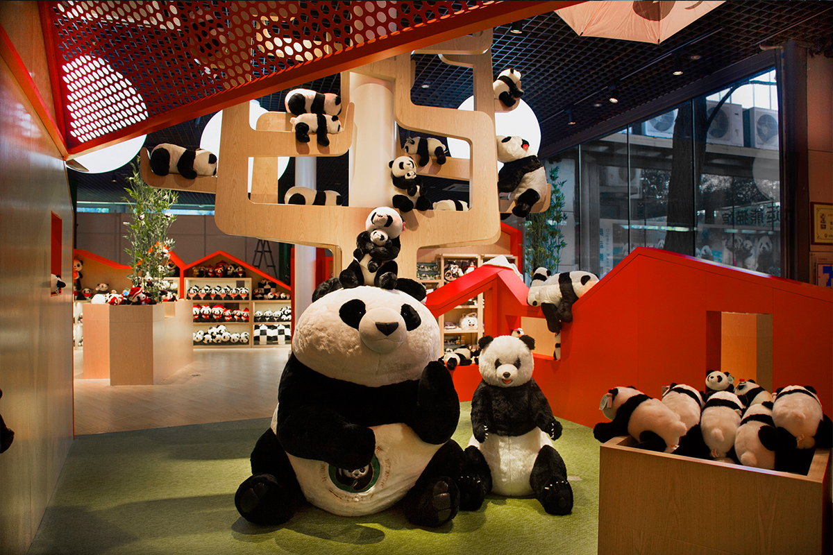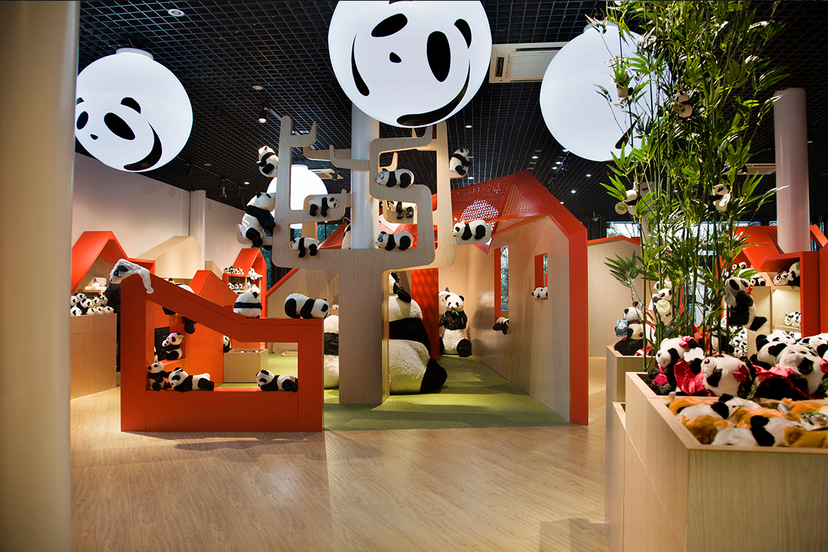 店铺以熊猫为主题,并以熊猫村为设计理念,在类似草丛树木的商品展示架及平台上展示熊猫玩具及相关主题产品,以图创造熊猫在大自然游玩的轻松及欢乐购物氛围。
