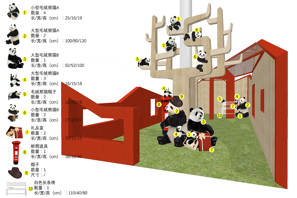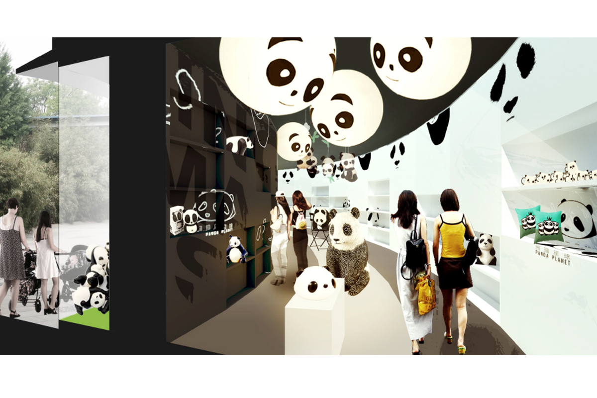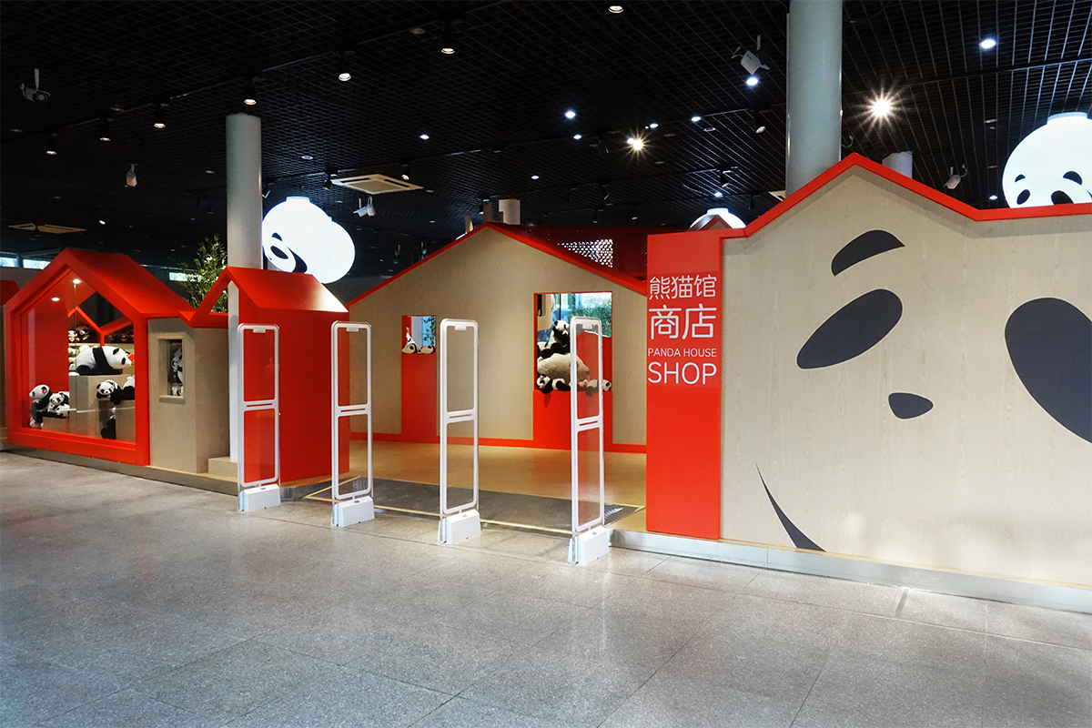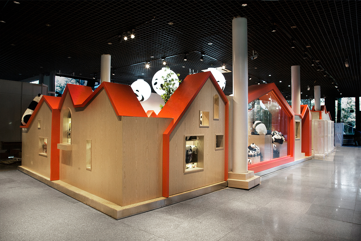 店铺以熊猫为主题,并以熊猫村为设计理念,在类似草丛树木的商品展示架及平台上展示熊猫玩具及相关主题产品,以图创造熊猫在大自然游玩的轻松及欢乐购物氛围。