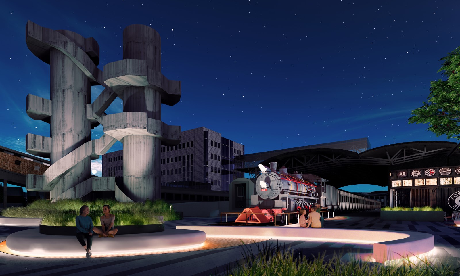 本次改造的“火车头”广场是751内重要的广场,751与798联结的重要节点,也是游客聚集的主要空间,广场内散布着大量独一无二的工业遗迹(火车头、双塔罐、输煤廊、天车等)。