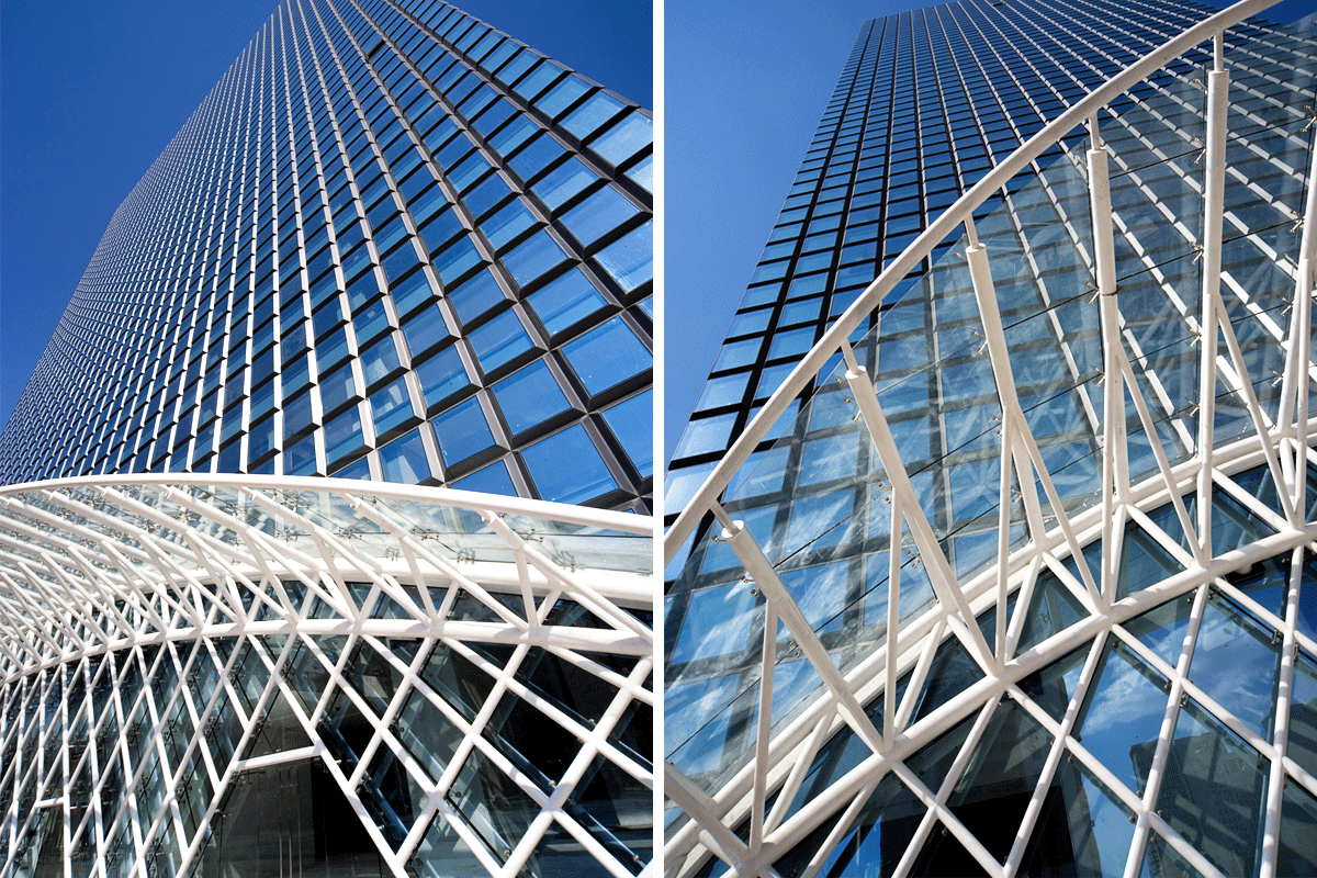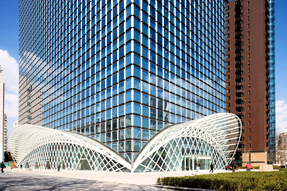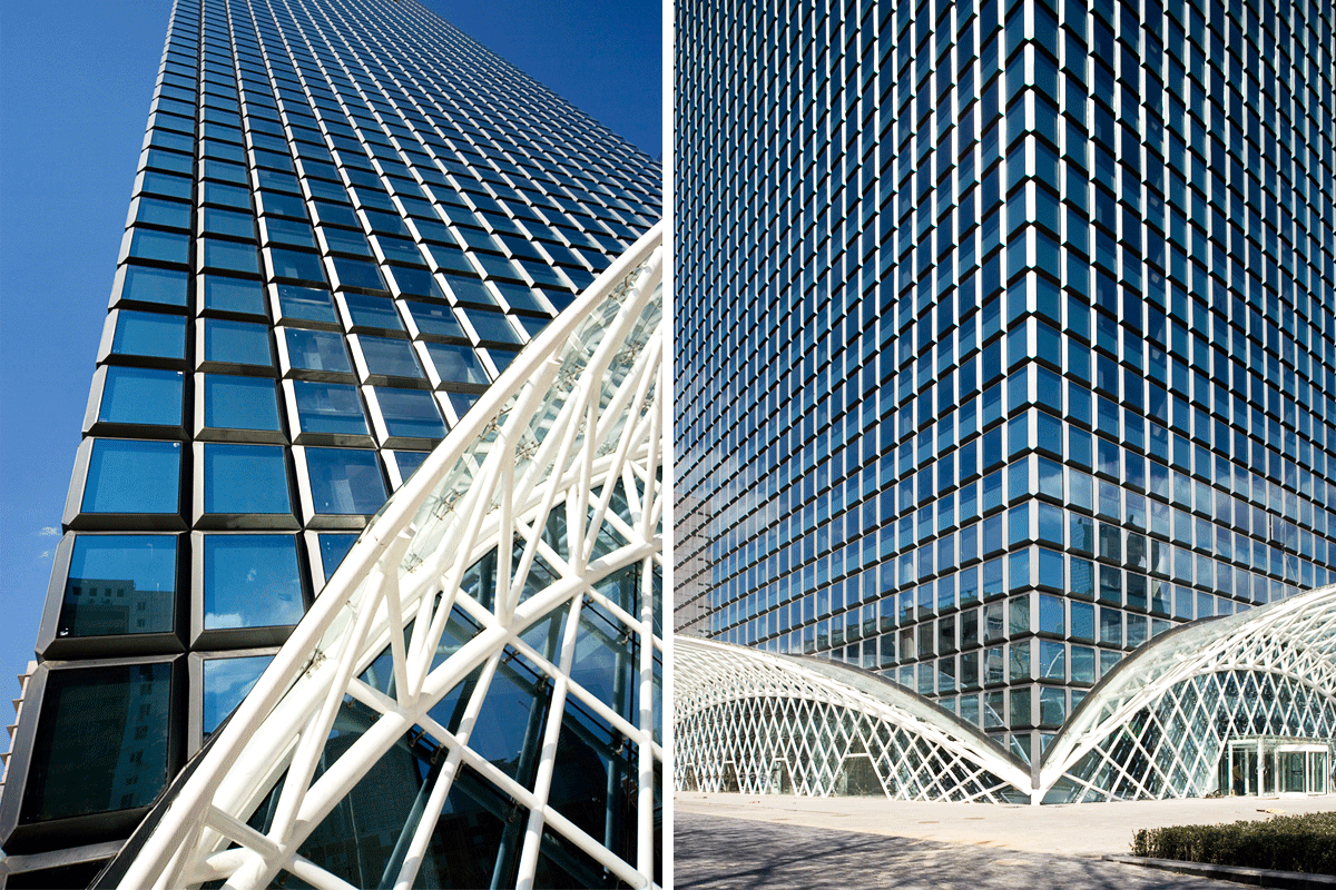1#楼定位为5A级写字楼,2#楼定位为高档公寓,建筑布局采用围合式,注重楼体之间自然围合而成的空间与周围喧闹环境的对比,从而在基地北侧为使用者营造了一个静谧的内庭院。为体现本项目尊贵,成熟的商务形象,建筑设计时更多考虑的是使用者的感受,落地的大片玻璃,大块的实墙分割,科学的实墙面与玻璃面的配比,使本建筑更富有内涵的同时,更加注重节能,体现了本项目对环境的尊重。