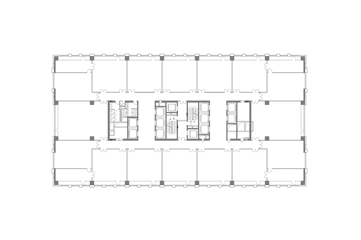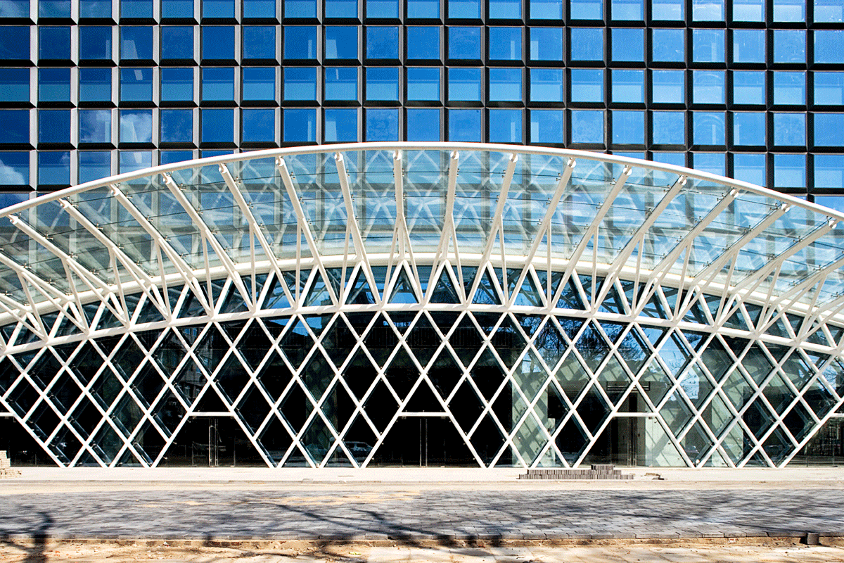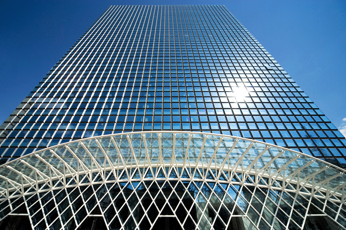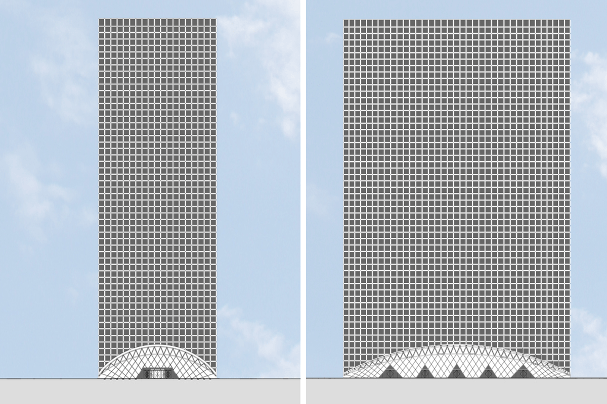 1#楼定位为5A级写字楼,2#楼定位为高档公寓,建筑布局采用围合式,注重楼体之间自然围合而成的空间与周围喧闹环境的对比,从而在基地北侧为使用者营造了一个静谧的内庭院。为体现本项目尊贵,成熟的商务形象,建筑设计时更多考虑的是使用者的感受,落地的大片玻璃,大块的实墙分割,科学的实墙面与玻璃面的配比,使本建筑更富有内涵的同时,更加注重节能,体现了本项目对环境的尊重。