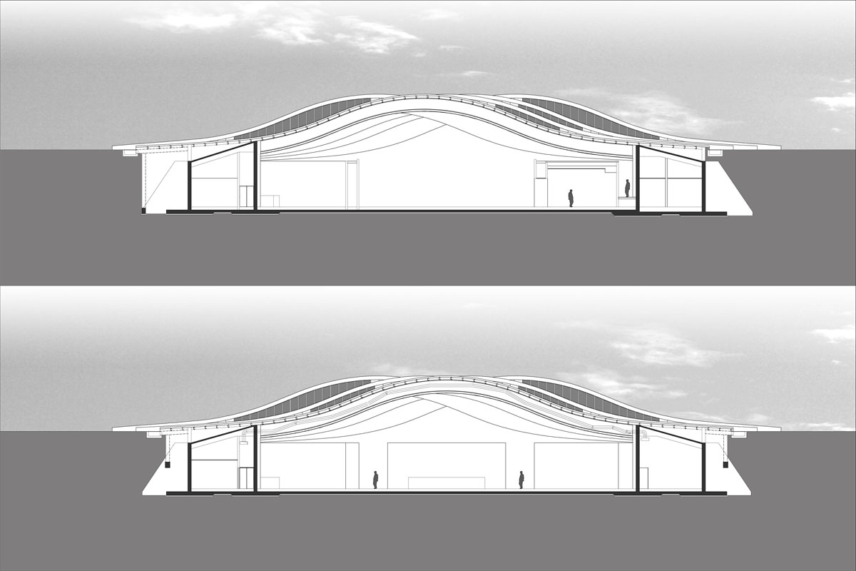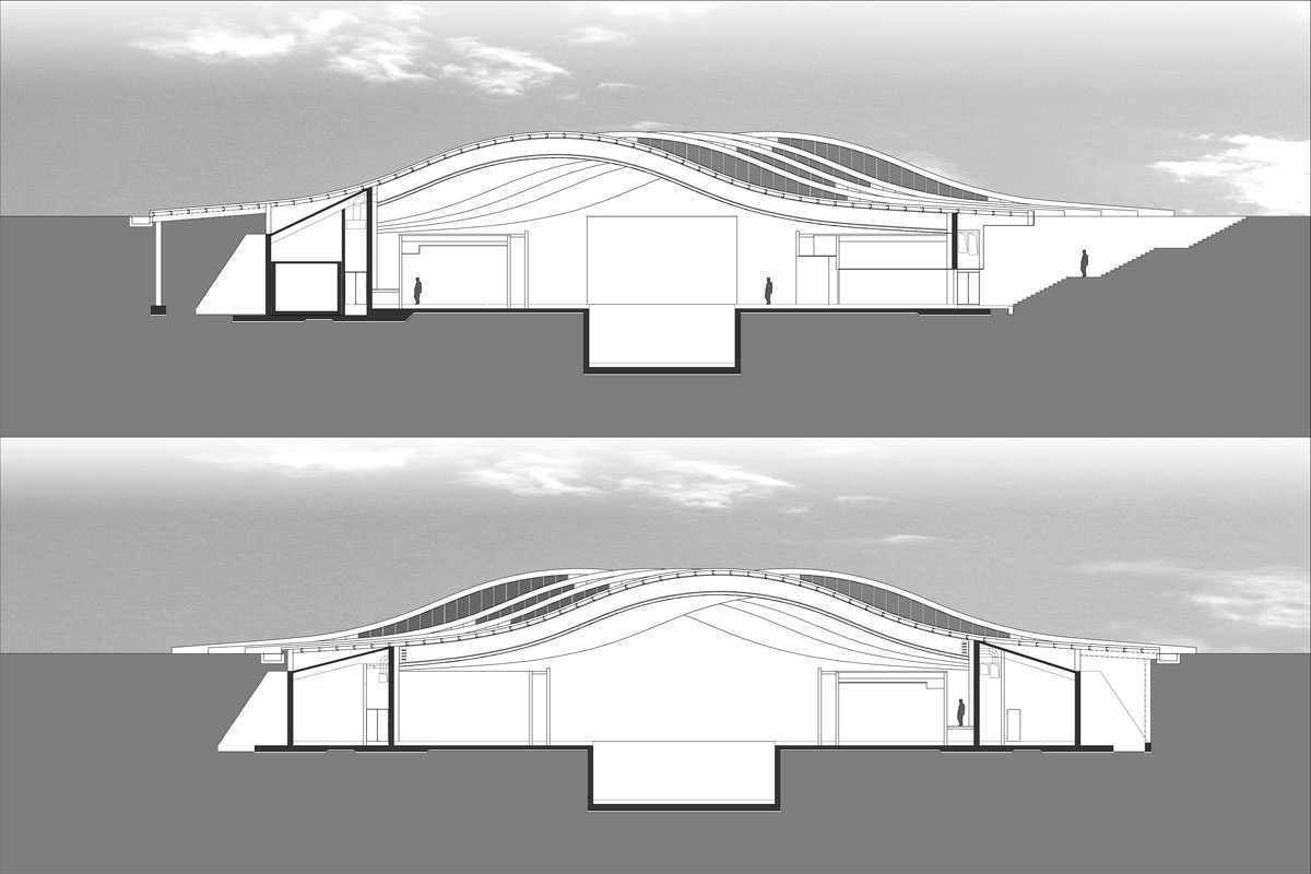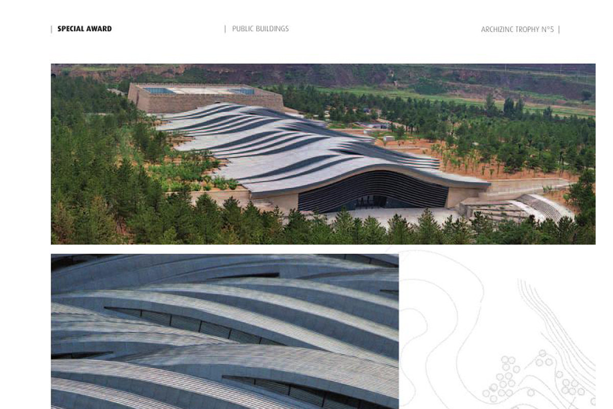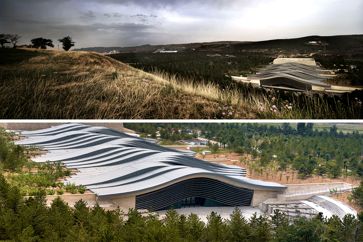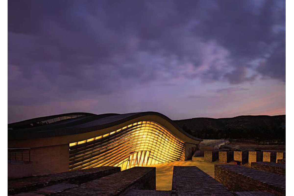 陈列馆建筑结构形式是剪力墙加大跨度钢结构屋面,主体用66榀、长40米、重达17吨的拱形钢梁交错排列而成,形成一个多波浪形的完美结构。屋顶立面显现多个佛眼,与石窟大佛交相辉映。建筑物地下6米,地面以上最高点标高5.8米。南端通过佛龛通道直达演艺中心,北端为一个下沉式广场,通过木栈道可达石窟主景区。