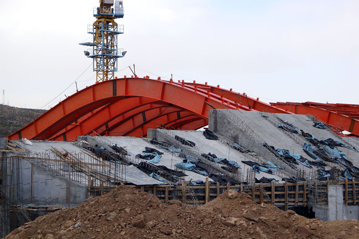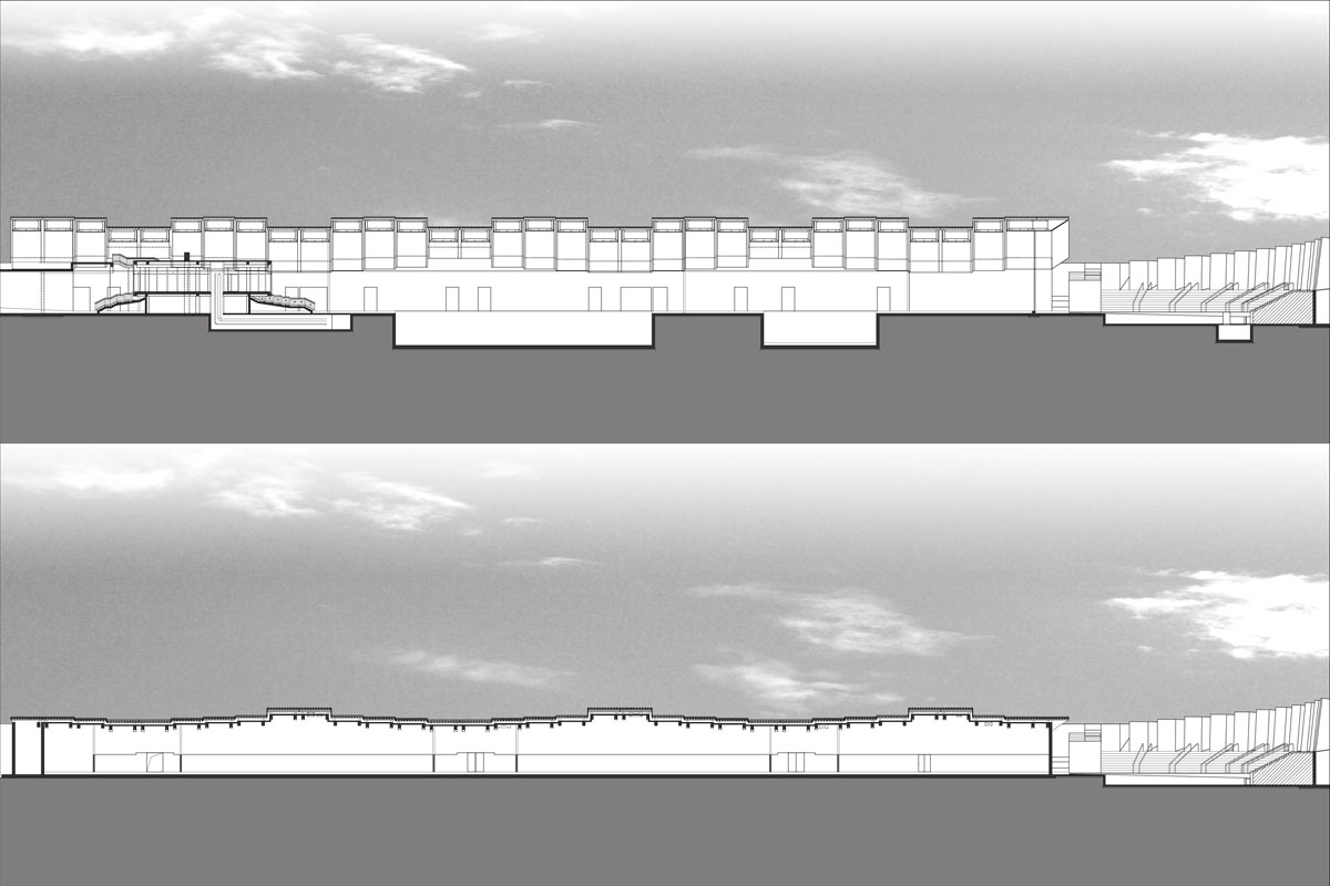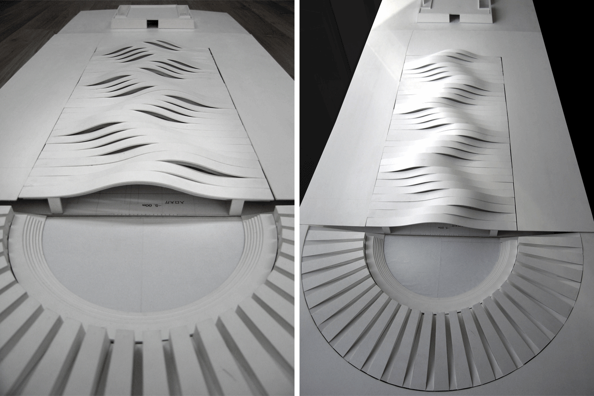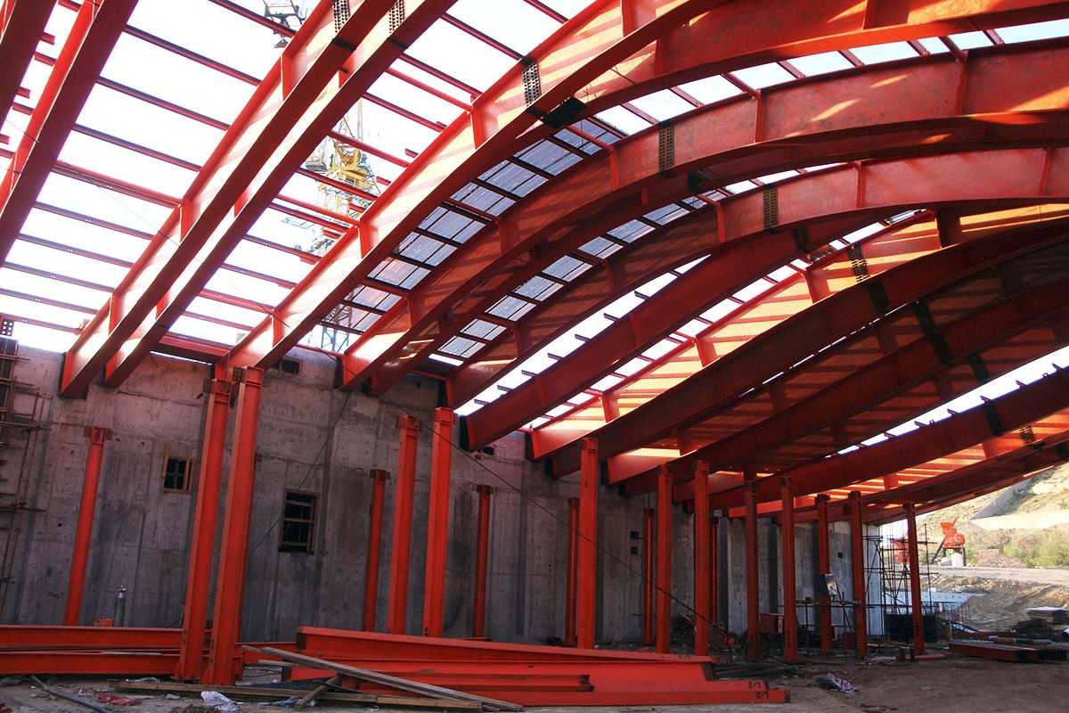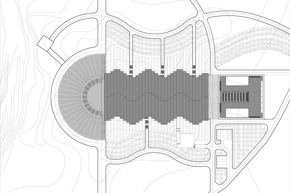 陈列馆建筑结构形式是剪力墙加大跨度钢结构屋面,主体用66榀、长40米、重达17吨的拱形钢梁交错排列而成,形成一个多波浪形的完美结构。屋顶立面显现多个佛眼,与石窟大佛交相辉映。建筑物地下6米,地面以上最高点标高5.8米。南端通过佛龛通道直达演艺中心,北端为一个下沉式广场,通过木栈道可达石窟主景区。