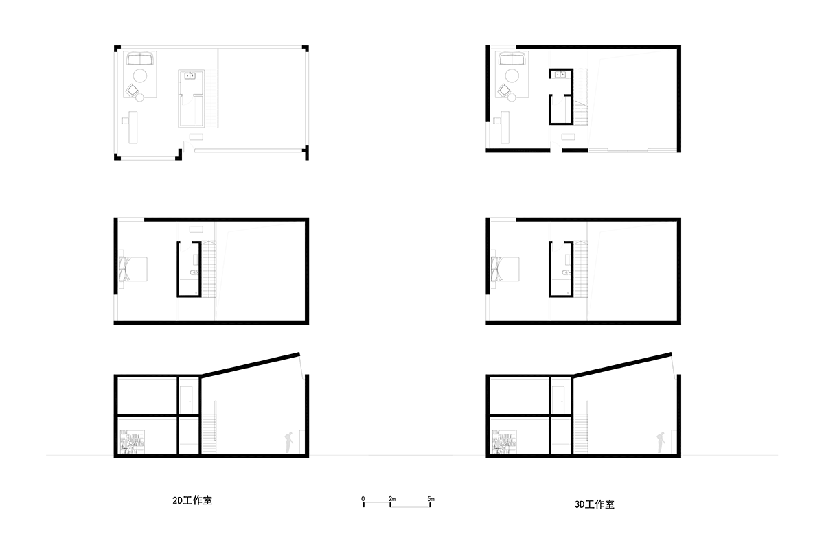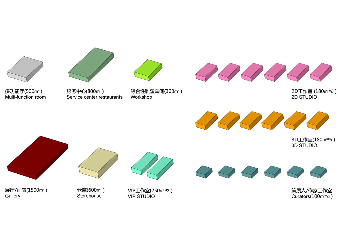 这个项目的主要挑战是从零开始创建一个艺术村。基地并没有给我们任何对方案意向的直接引导或指引。我们决定从主要入口、交通流线及功能组织入手。在这个过程中,我们设计了几个未来画家村不同方案。