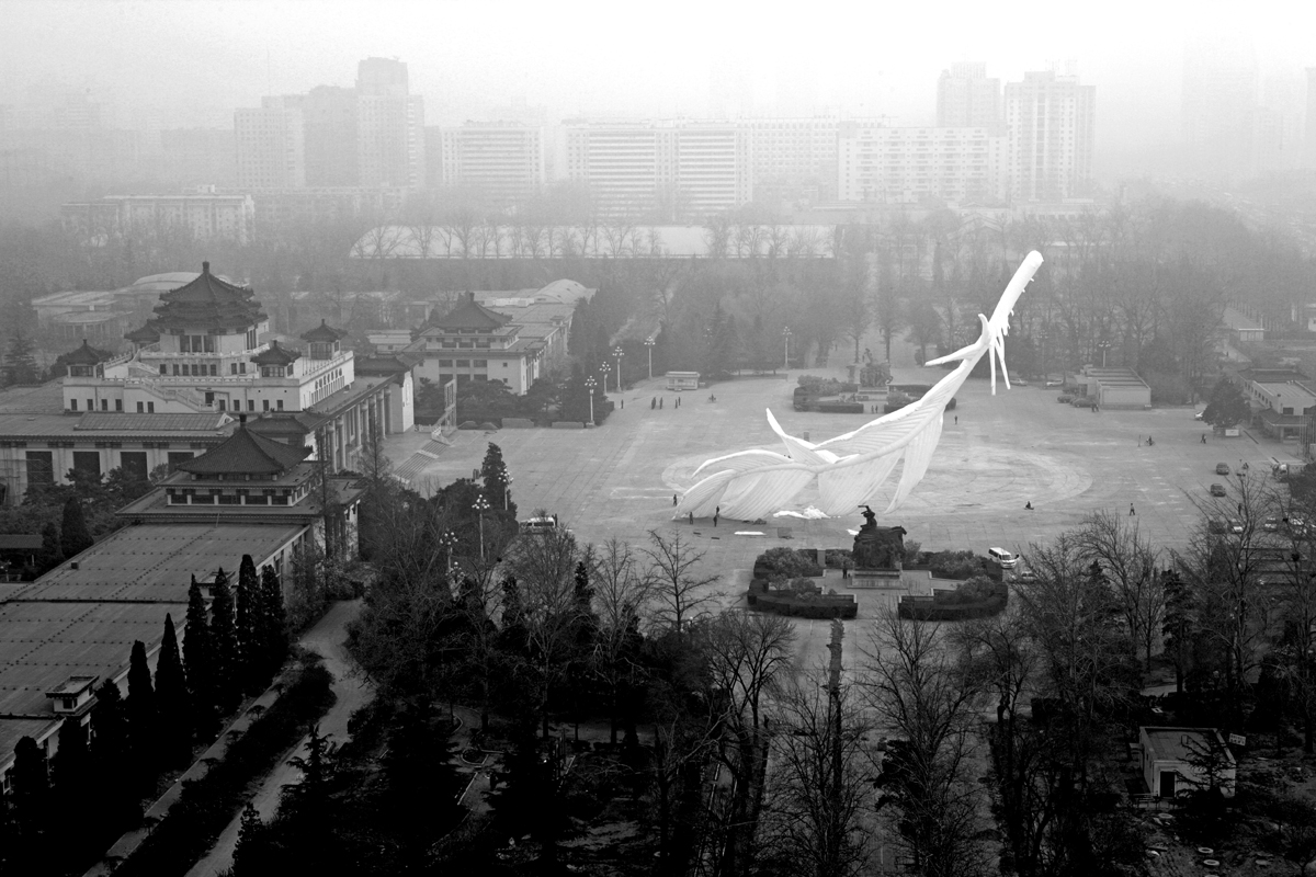 謝:你曾經說這個狀態是可樂的狀態,跟你進行的反諷或者是嘲弄是同一性質的東西嗎? 程:有一部分是反諷,但更多是可樂的,這一個羽毛做到最後應該是一個傷感,悲傷,不美,很糟糕,頹廢的,一切負面的,而且趕上那一天是一個非常好的沙塵暴的天,我覺得這個非常好,比我以前想的藍天白雲飄著羽毛還要好。