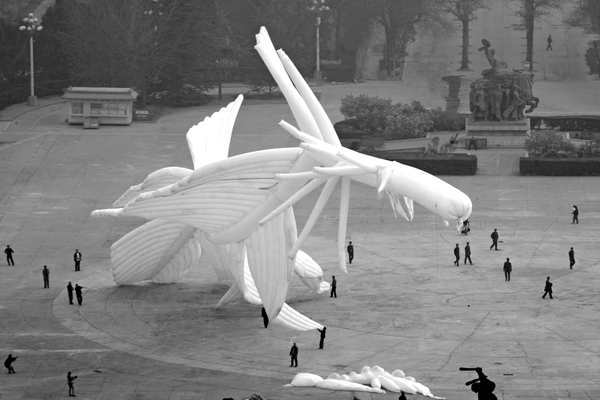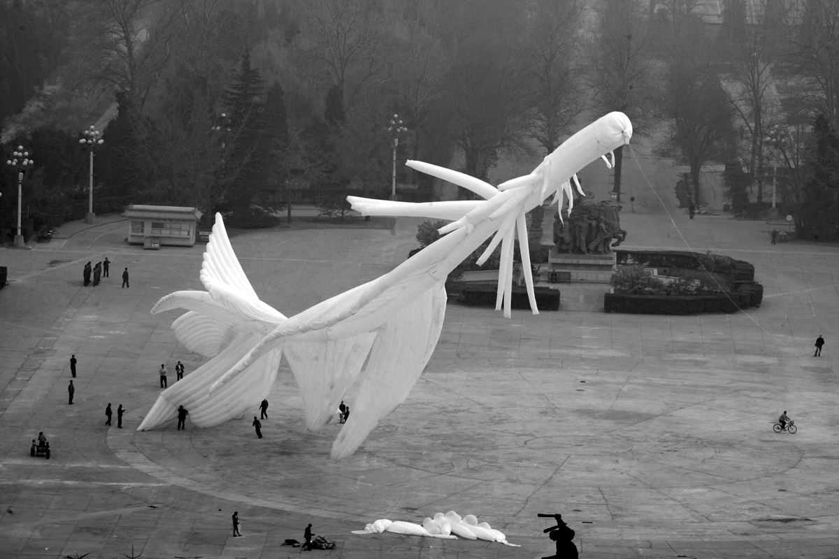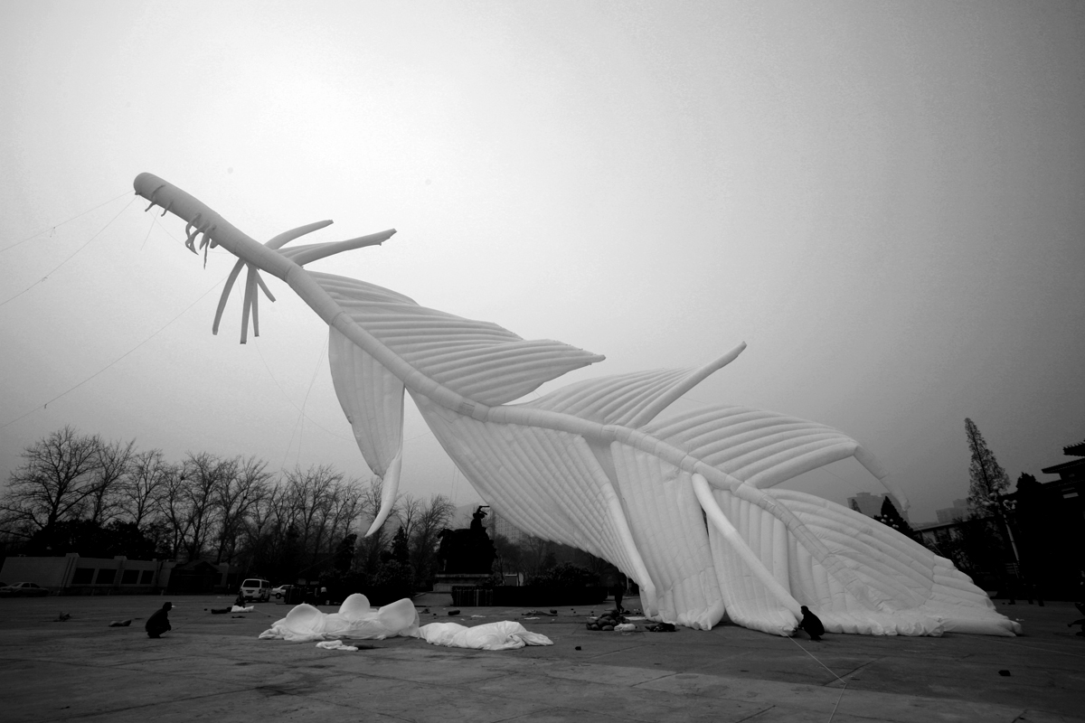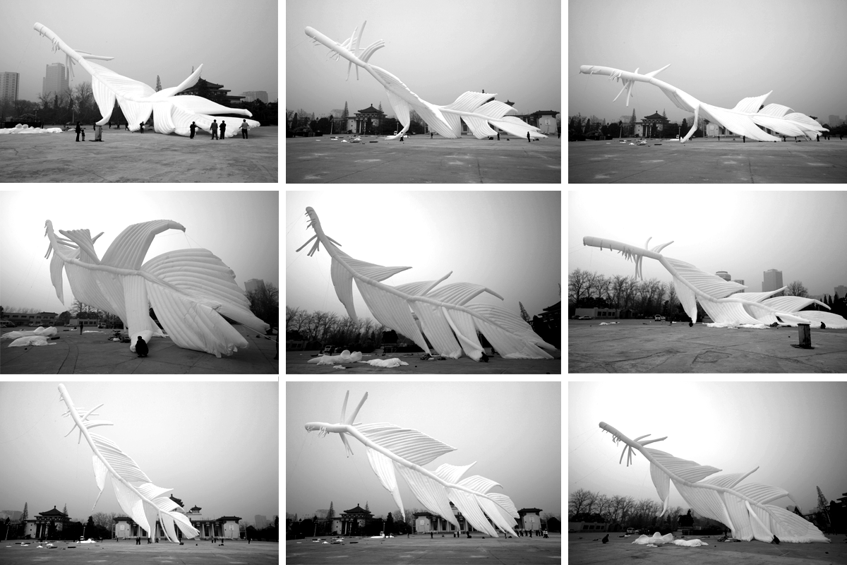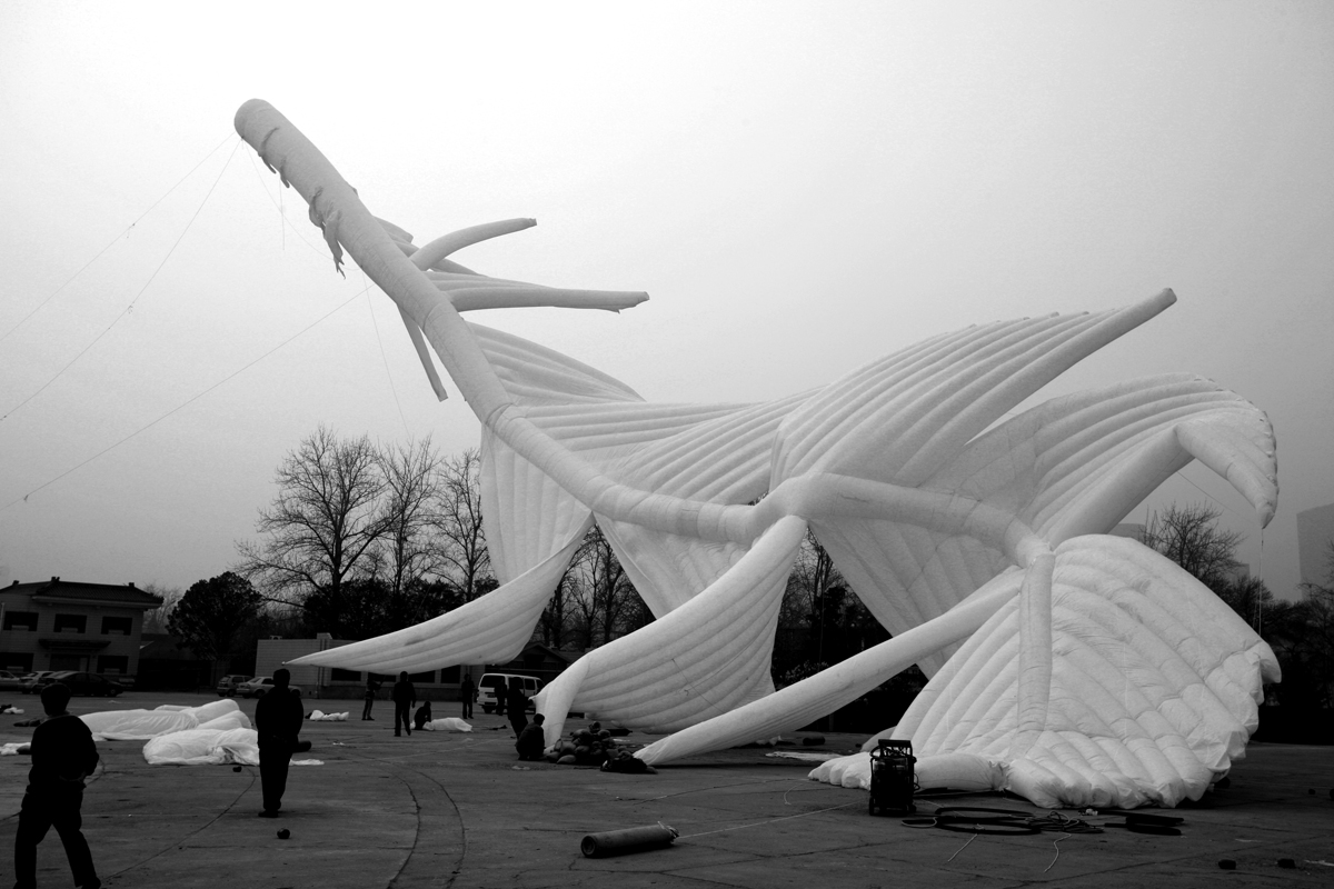 程:特別符合,非常糟糕,北京表面本身應該是個特別潔白的東西。羽毛裡充滿著氦氣。後來浮力太大把後面又給剪了,這一堆布剪了十幾米,怕它浮力太大了。都是扭曲的。 謝:真的飛起來時與你預期是一樣的嗎?。